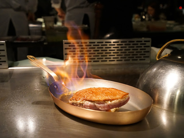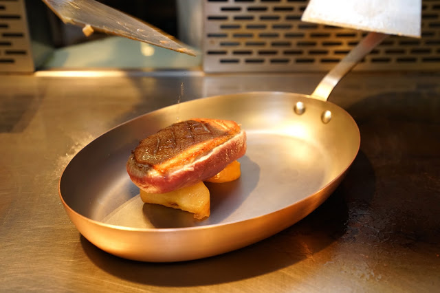 先在鐵板上將鴨皮的那面煎到金黃酥脆,然後放入平底鍋裡用白蘭地點火去煮,將肉汁緊緊鎖在肉中,並讓這份鴨胸的香氣更加豐富。
