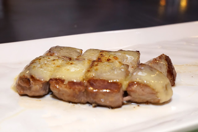 煎好的伊比利豬香氣四溢,將康堤起司融化在這份豬里肌上增加香氣與口感,康堤起司味道淡雅,不會壓過伊比利豬的味道,可以品嚐到豬里肌的肉質原味,味道搭配得非常好。