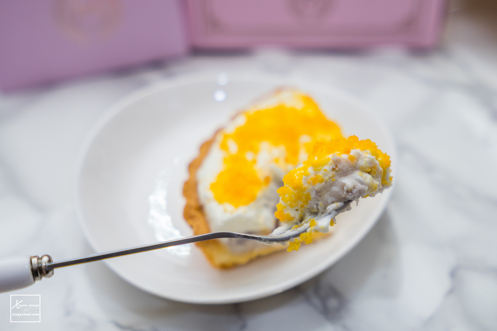 最上層是撒上了鹹蛋黃,在鮮奶油和芋頭餡料的搭配,這款派色調繽紛青春,鹹蛋黃口感微鹹