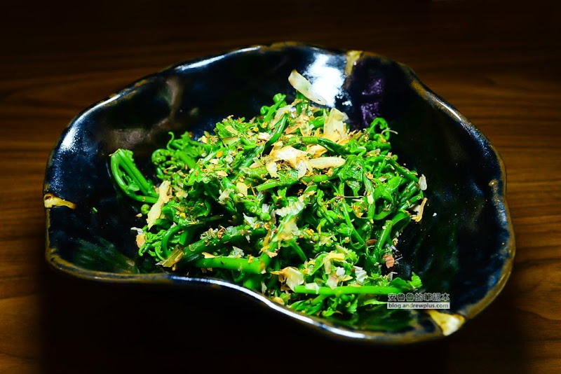 舖上柴魚和桂花的涼拌菜,淋上些許和風醬汁,帶點酸甜滋味,吃起來帶一點滑滑澀澀的口感,咬起來很清脆