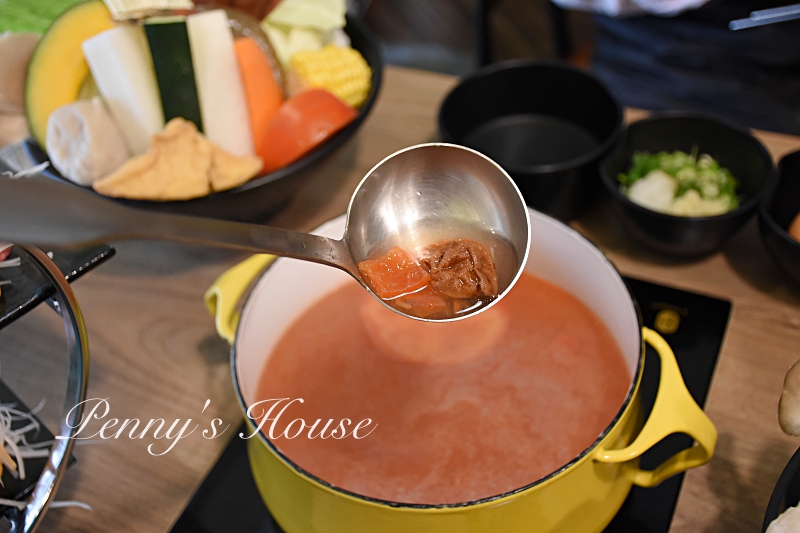 聽到番茄鍋,一開始應該跟我一樣會覺得這應該很多店都有,但是這裡的番茄鍋很不一樣唷! 除了喝得出番茄的鮮甜滋味,裡面居然還有一顆酸梅?!湯裡面沒有明顯的酸梅甜味,但我想它應該是提味的好幫手~ 別看它好像很清淡,但其實味道很足夠,煮起海鮮或是肉品,味道非常棒,就連湯頭都不容錯過!超級適合夏天~~~~
