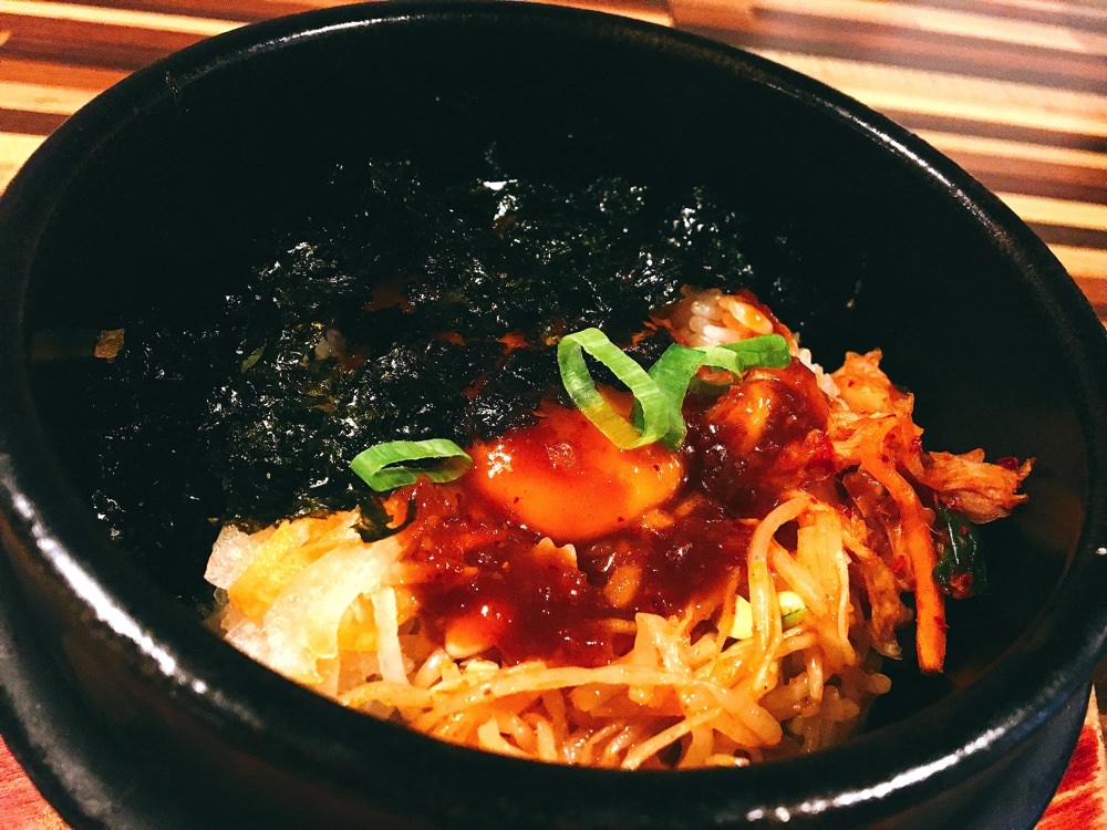 就如同石鍋拌飯,裡頭的料有泡菜、豆芽、海苔、濟州醬、蛋黃,