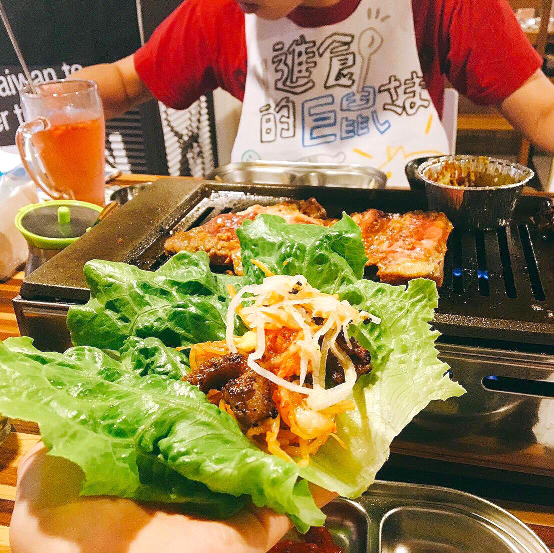 我個人試了幾種,最後還是喜歡單純用生菜包肉加點豆芽或泡菜最好吃!