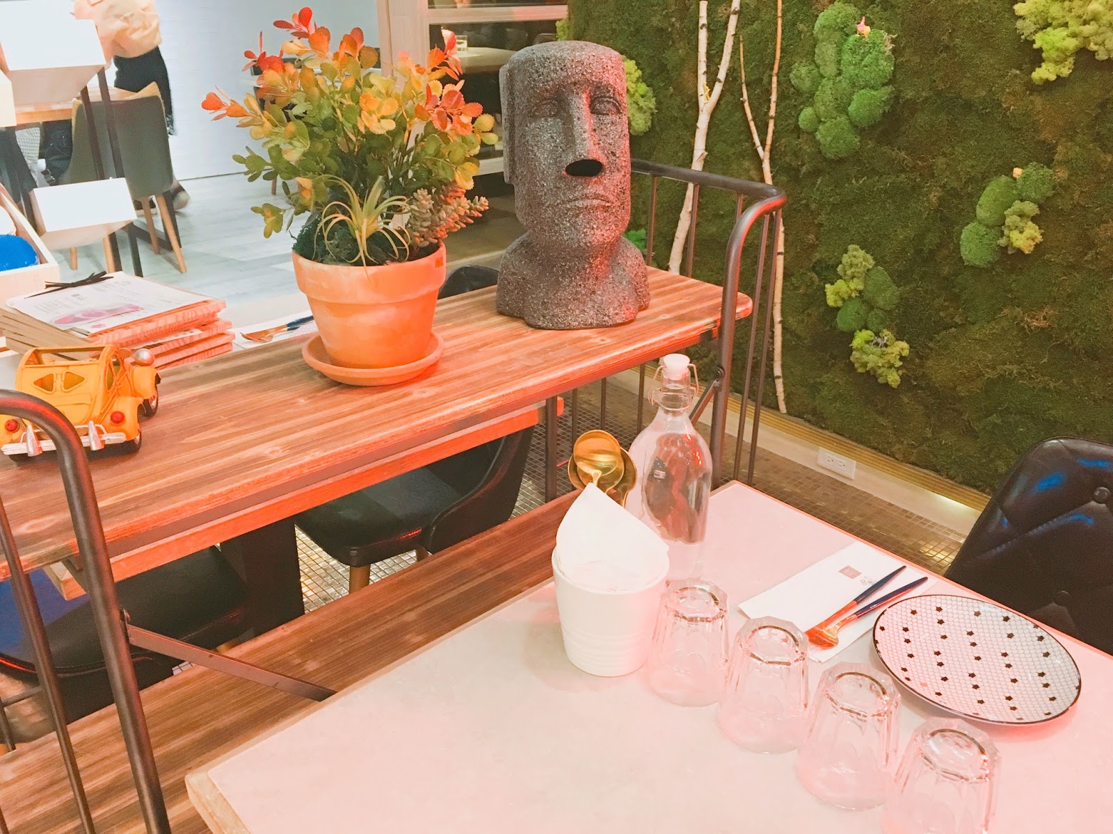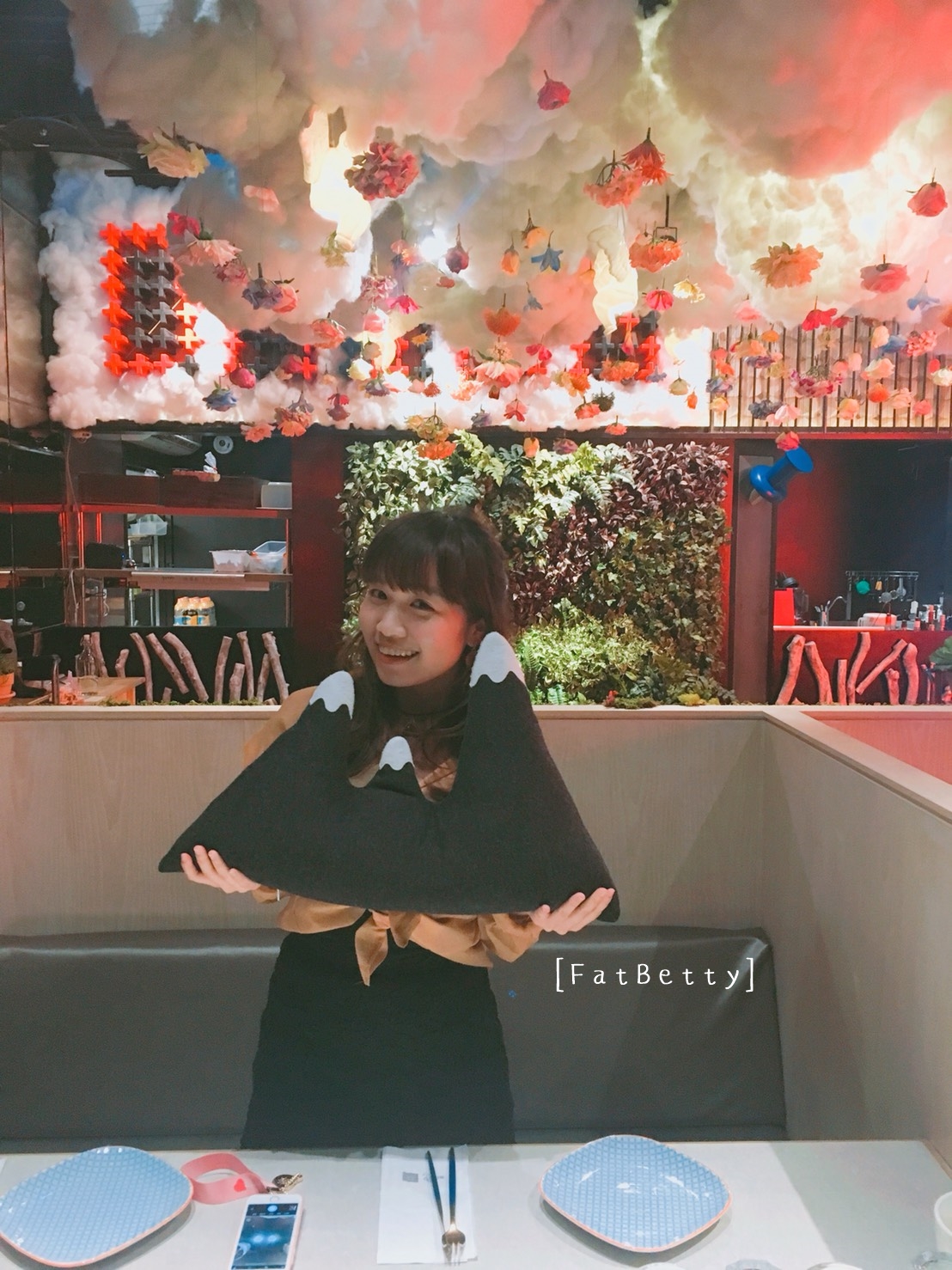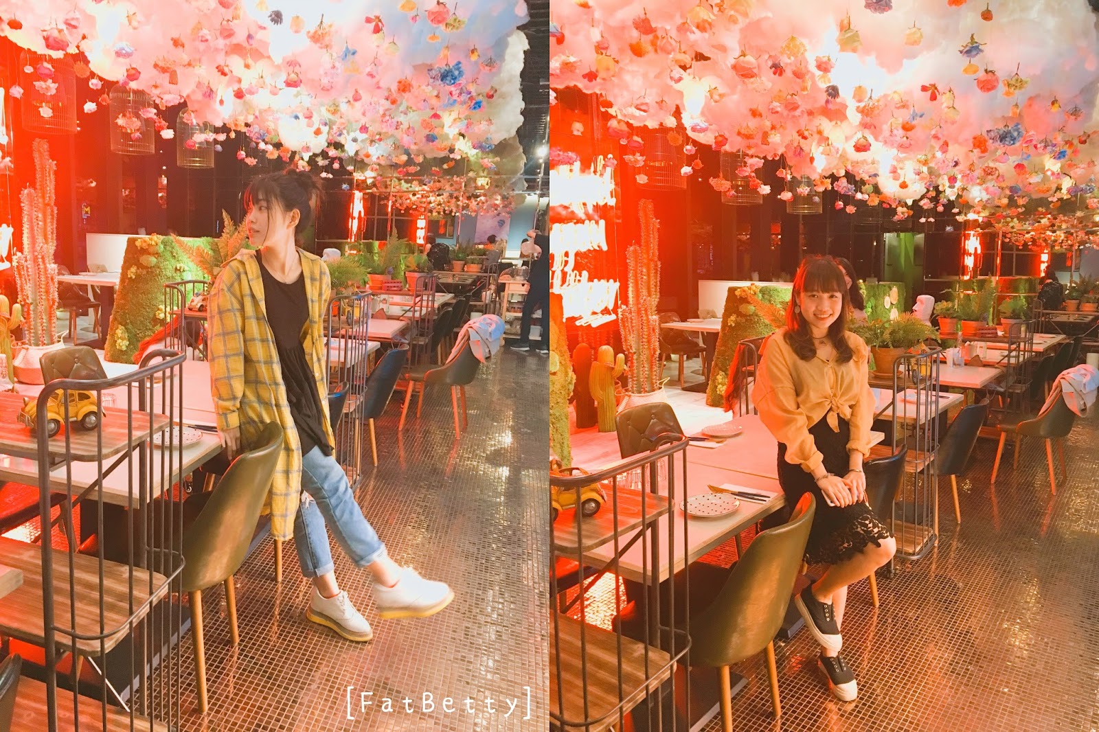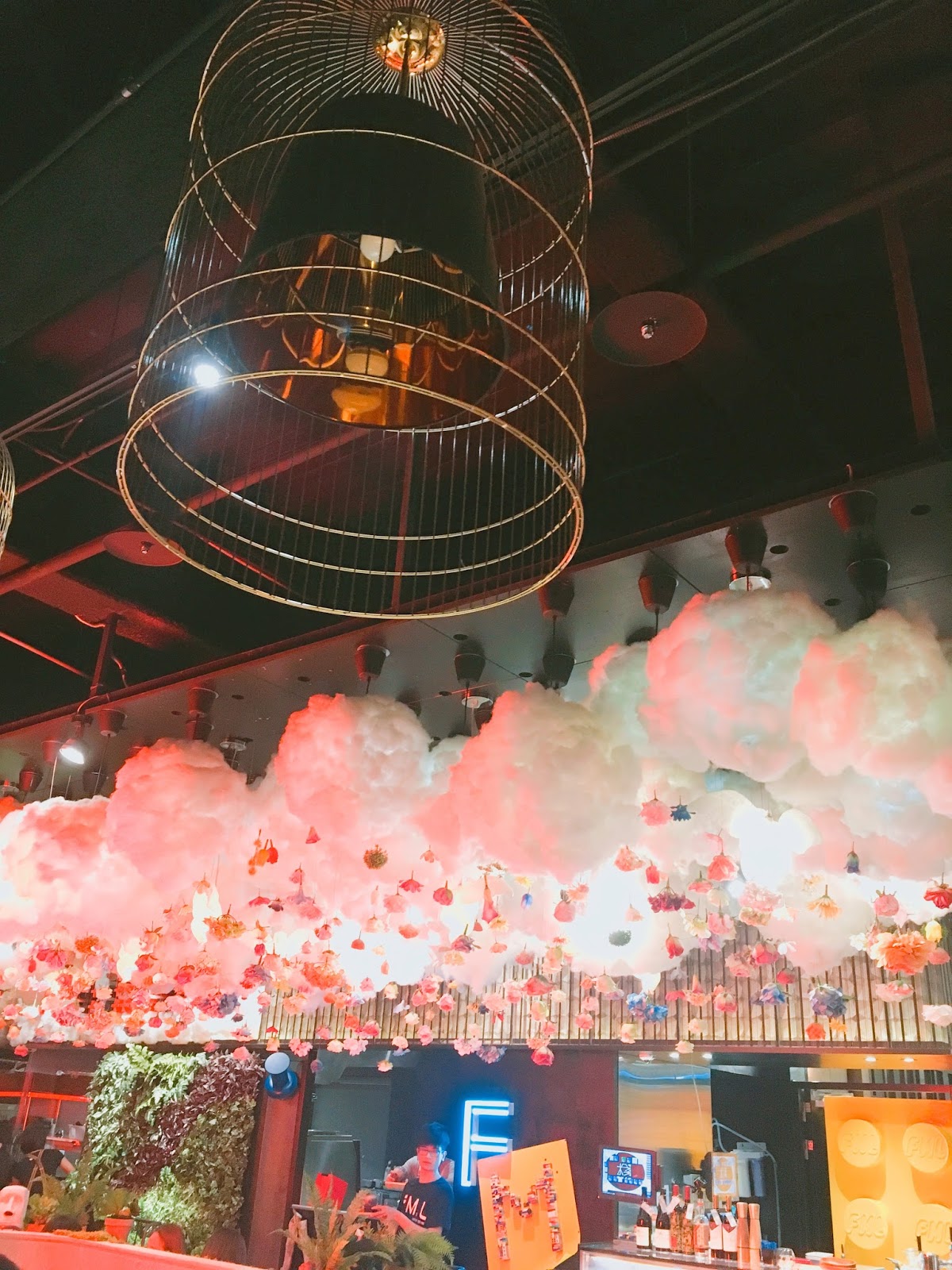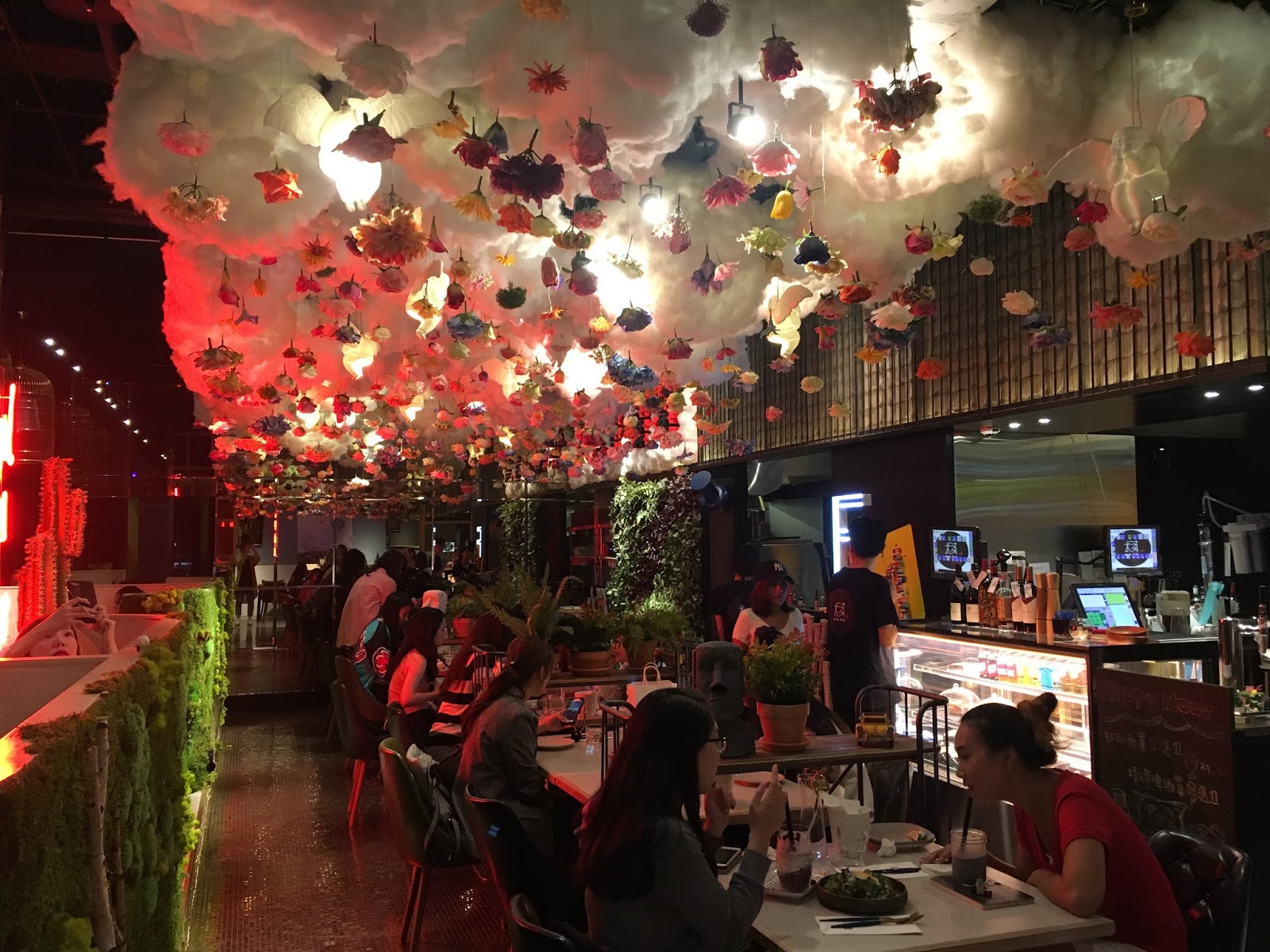 店內使用了很多霓虹燈、花、草地的造景,為了氣氛的營造