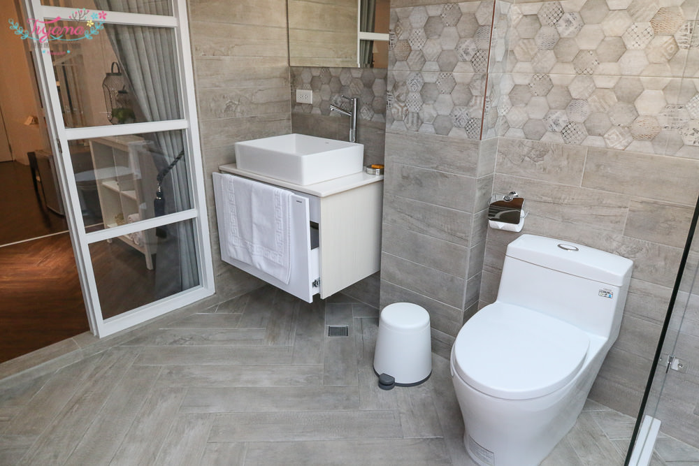 房間最愛的竟然是浴室,選用淺灰和菱型拼磚,大空間加上自然光,讓視覺感更開闊通透,造型浴缸讓緹緹看了興奮不已,晚上泡澡泡到不想出來。