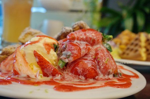 草莓和冰淇淋上滿滿的煉乳及草莓醬,