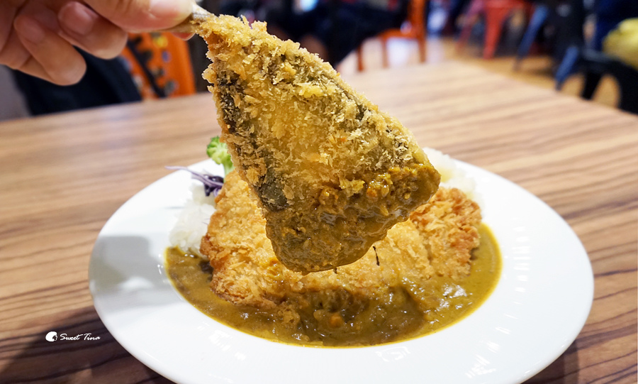 海陸特餐(豬排+竹莢魚) - 搭配的醬料為南洋椰奶咖哩,微辣的椰奶香氣相當順口,和炸豬排超級對味的,並還加入了些許的蔬菜,營養相當均衡。