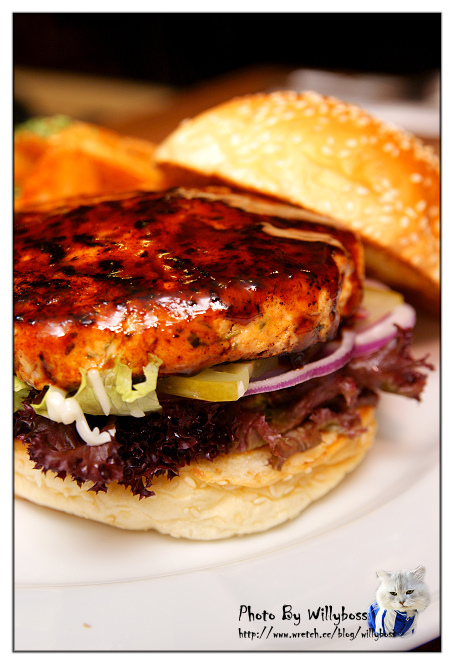 看看側面,牛漢堡肉上頭鋪了兩種不同顏色的起司,再放上切片蘑菇,底下則是一堆蔬菜,說真的不知道總匯在哪邊(以為會有什麼火腿或培根等等配角);麵包雖有烤過,不過用的麵包較弱,所以沒有什麼蓬鬆的感覺,牛漢堡肉部分很大沒話說,肉質和一般漢堡店吃到的扎實路線不同,是又軟又鬆散,但是肉汁卻很多,而且有淡淡的紅酒香,酒香讓肉味更添些層次,簡單說口感部分雖然較差,但是味道還是令人滿意的:),加上大口吃漢堡撐死的爽度,這餐吃下來大家都很開心啊XD!