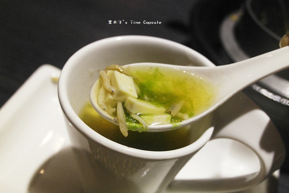 用了澎湖翠綠的日光海藻、豆腐和吻仔魚做出的湯品,