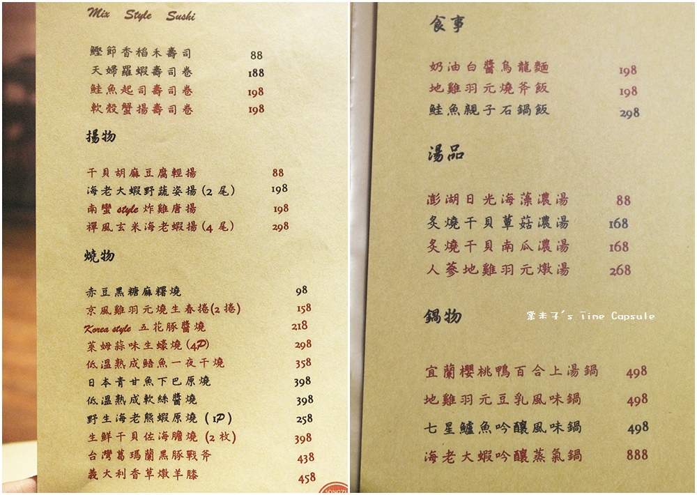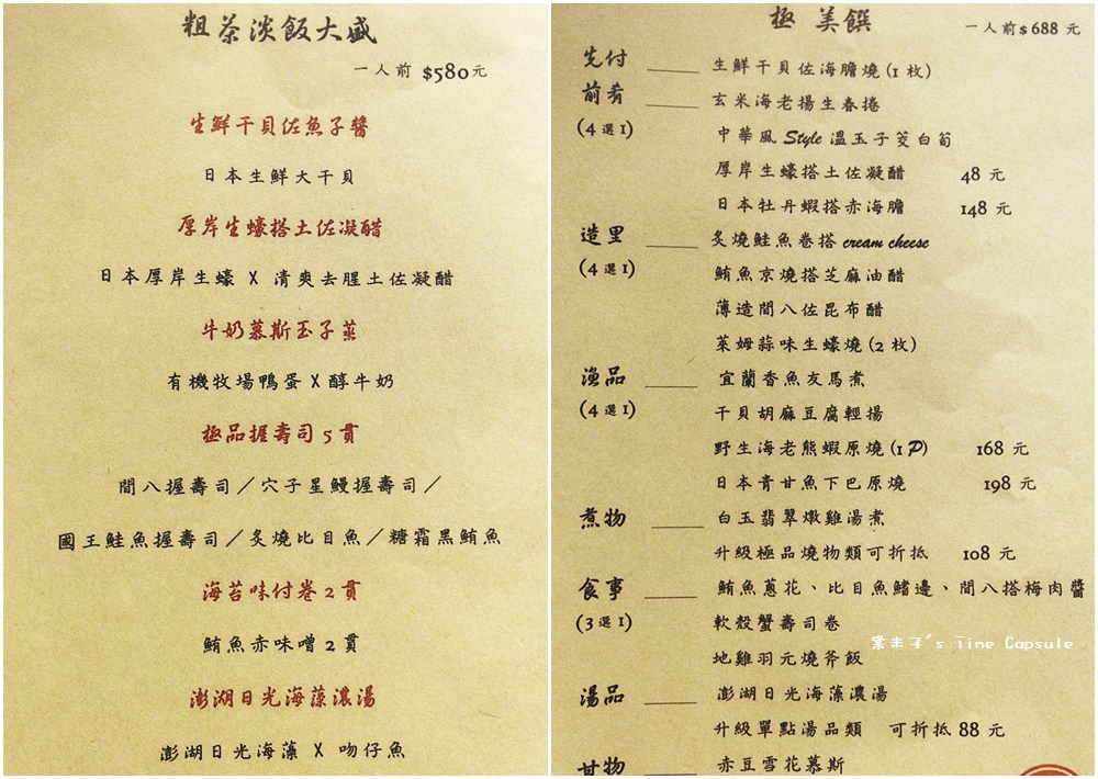 其中前肴、造里、漁品、煮物、食事、湯品都不只有一種選擇,