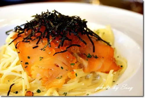 而吃起來結實緊密的義大利麵中,和剛剛的湯品一樣,番茄味相當濃郁,千層夾起來的麵條,吃起來口感卻很好,不會過軟或過硬,讓人覺得很喜歡。而一旁搭配蔬菜,像是櫛瓜、青花菜、袖珍菇,簡單的用蒜頭清炒提味,還不錯。