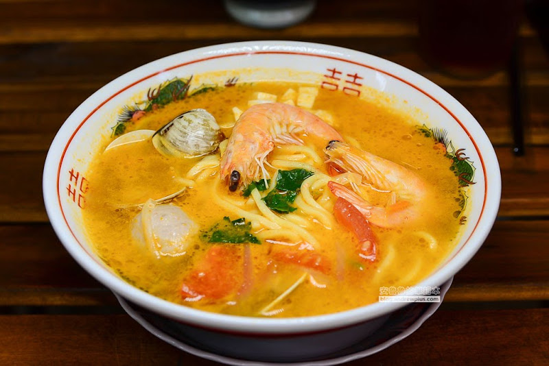 冬蔭功泰式海鮮湯麵 95元仿泰式的湯頭是台灣同學們會喜歡的酸甜辣,有後座力的辣度,讓人一喝就開胃,帶有彈性的麵條,再放入蝦子、貢丸、蛤蜊、蕃茄、洋蔥絲、豆腐丁,豐富的海鮮味也吃得飽