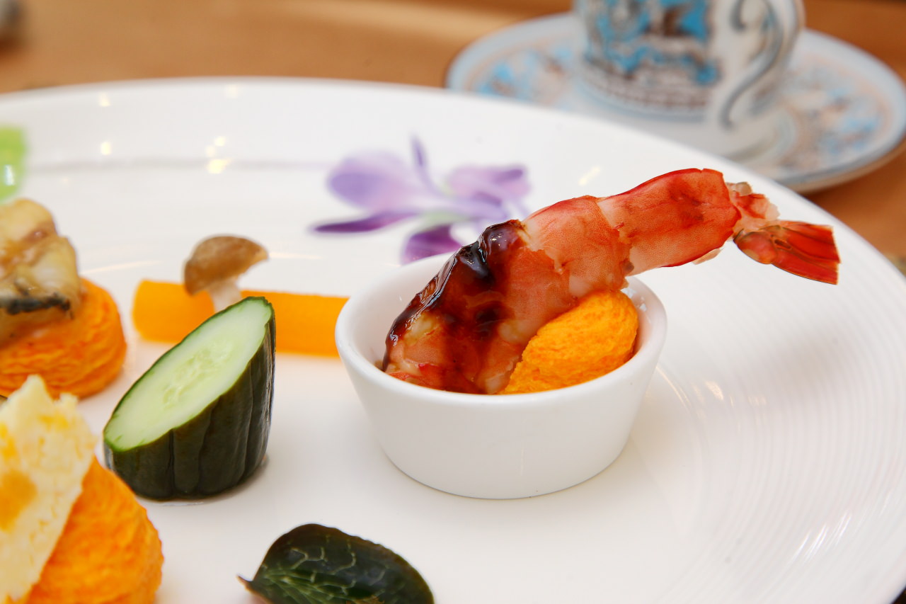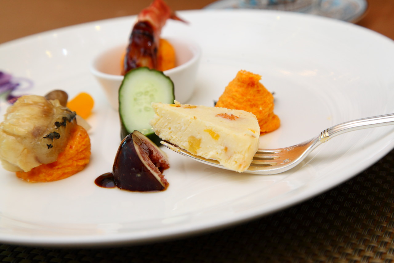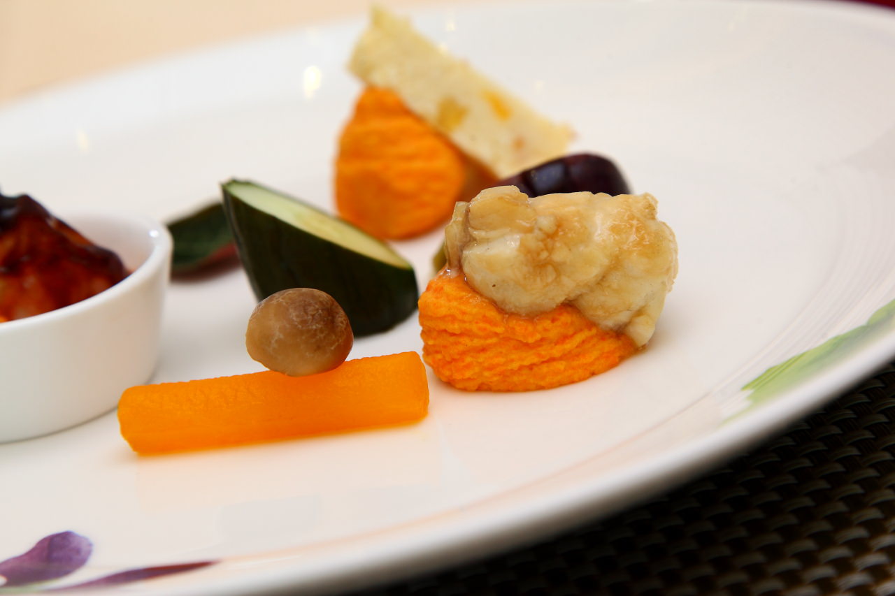 在傳統台菜中頭兩道菜一定有所謂的冷味拼盤,主廚與以精緻化,用法國進口的杏桃起司、低溫烹調的大蝦及煙燻龍膽佐以花漾盤飾,呈現猶如法式料理的精緻感,而每道菜餚底下都以紅蘿蔔提味增色的馬鈴薯泥鋪底