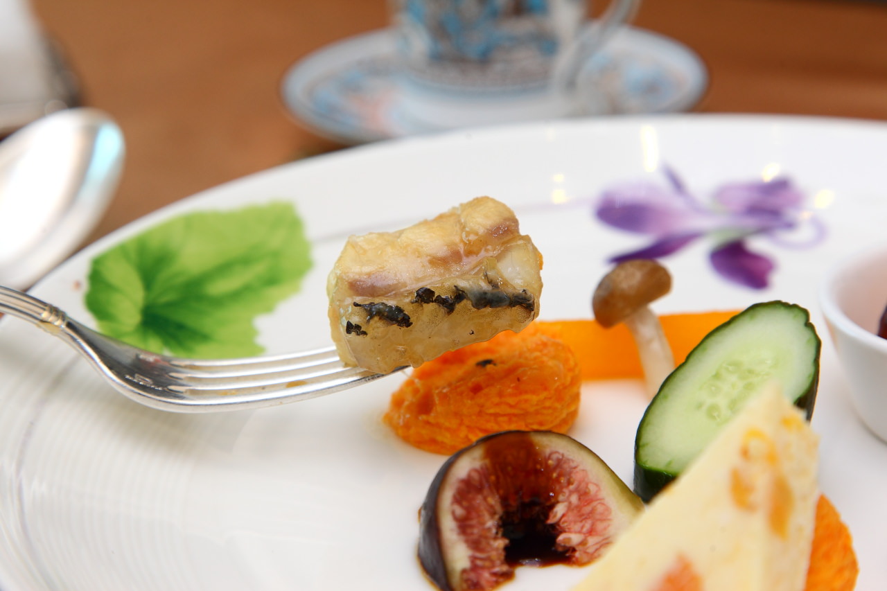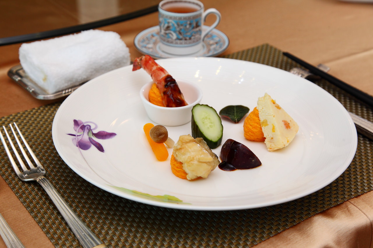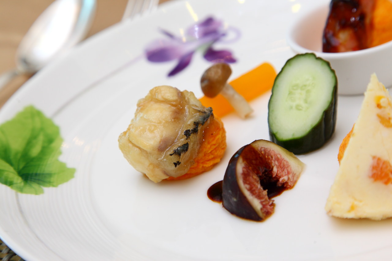 在傳統台菜中頭兩道菜一定有所謂的冷味拼盤,主廚與以精緻化,用法國進口的杏桃起司、低溫烹調的大蝦及煙燻龍膽佐以花漾盤飾,呈現猶如法式料理的精緻感,而每道菜餚底下都以紅蘿蔔提味增色的馬鈴薯泥鋪底
