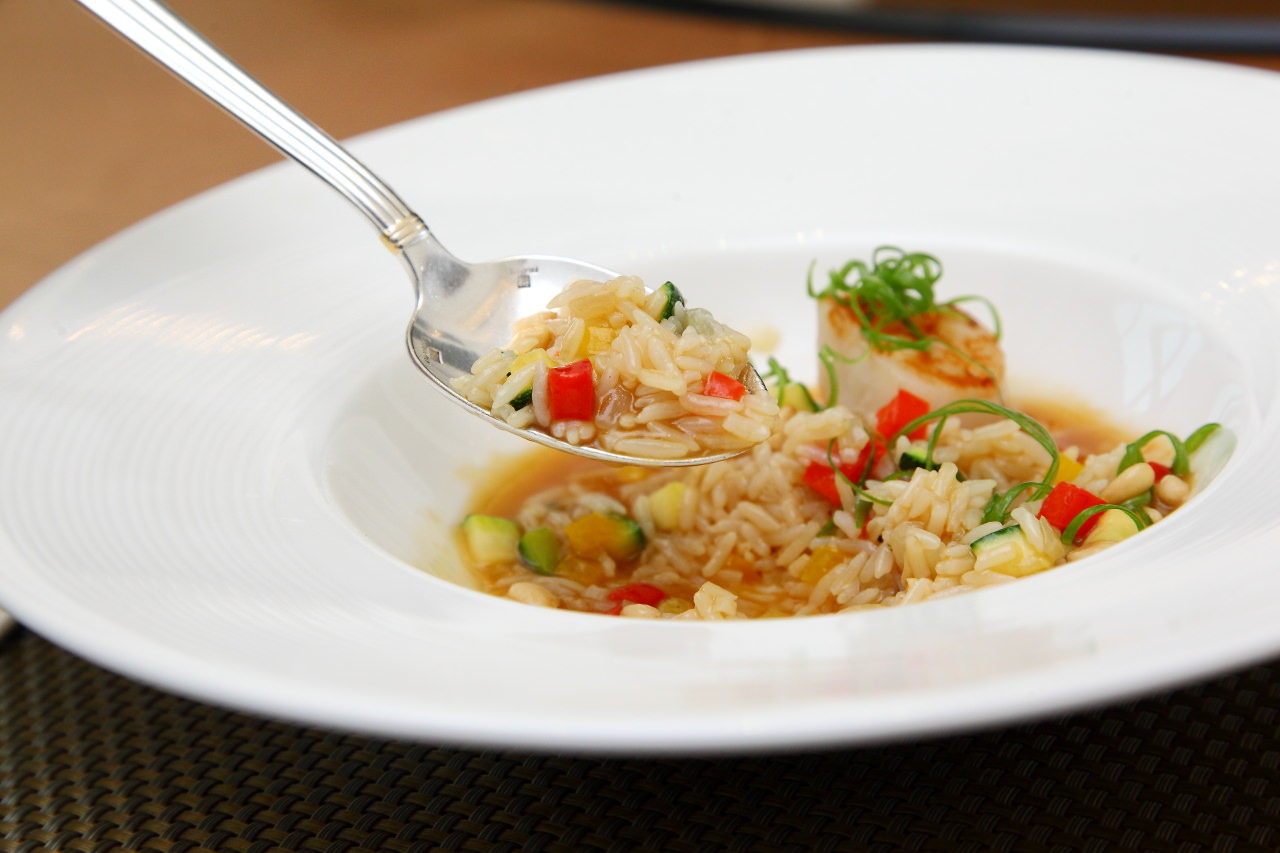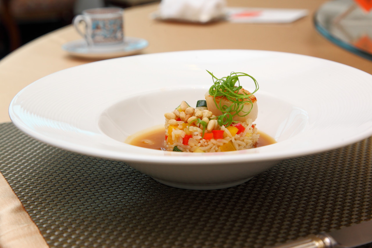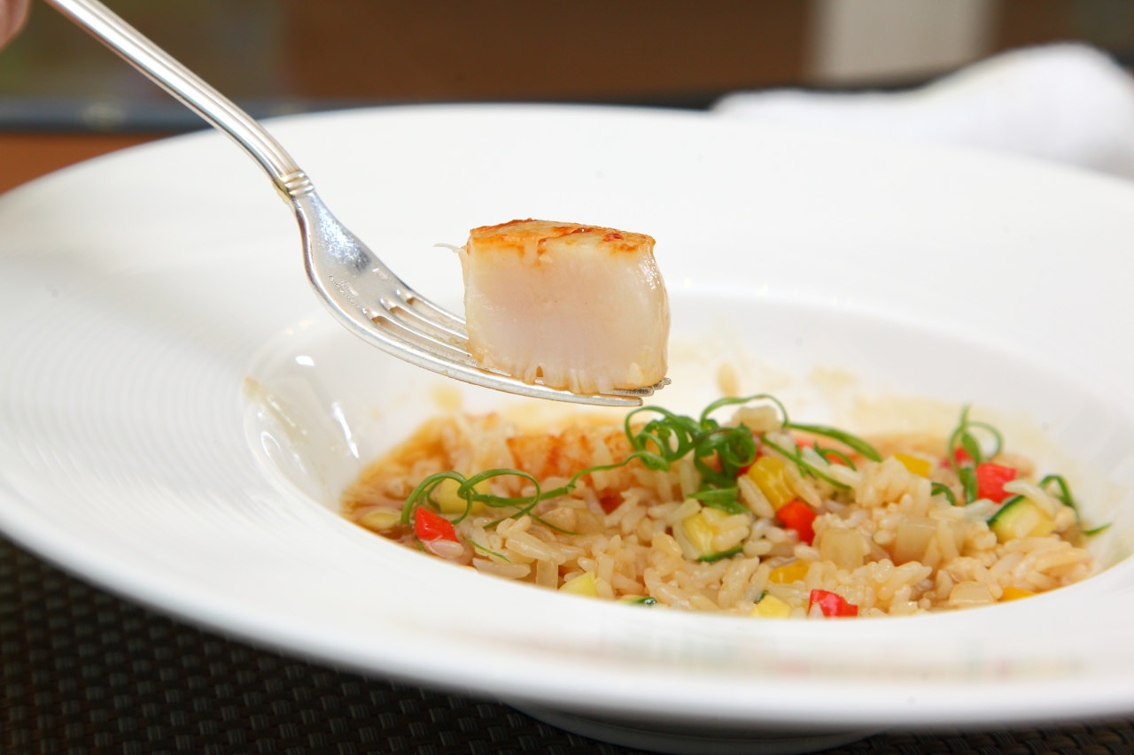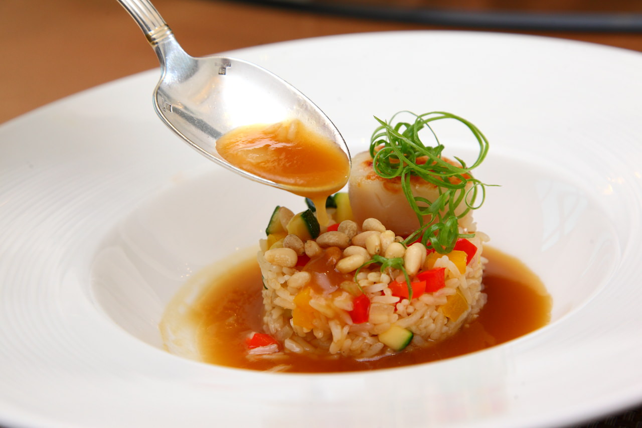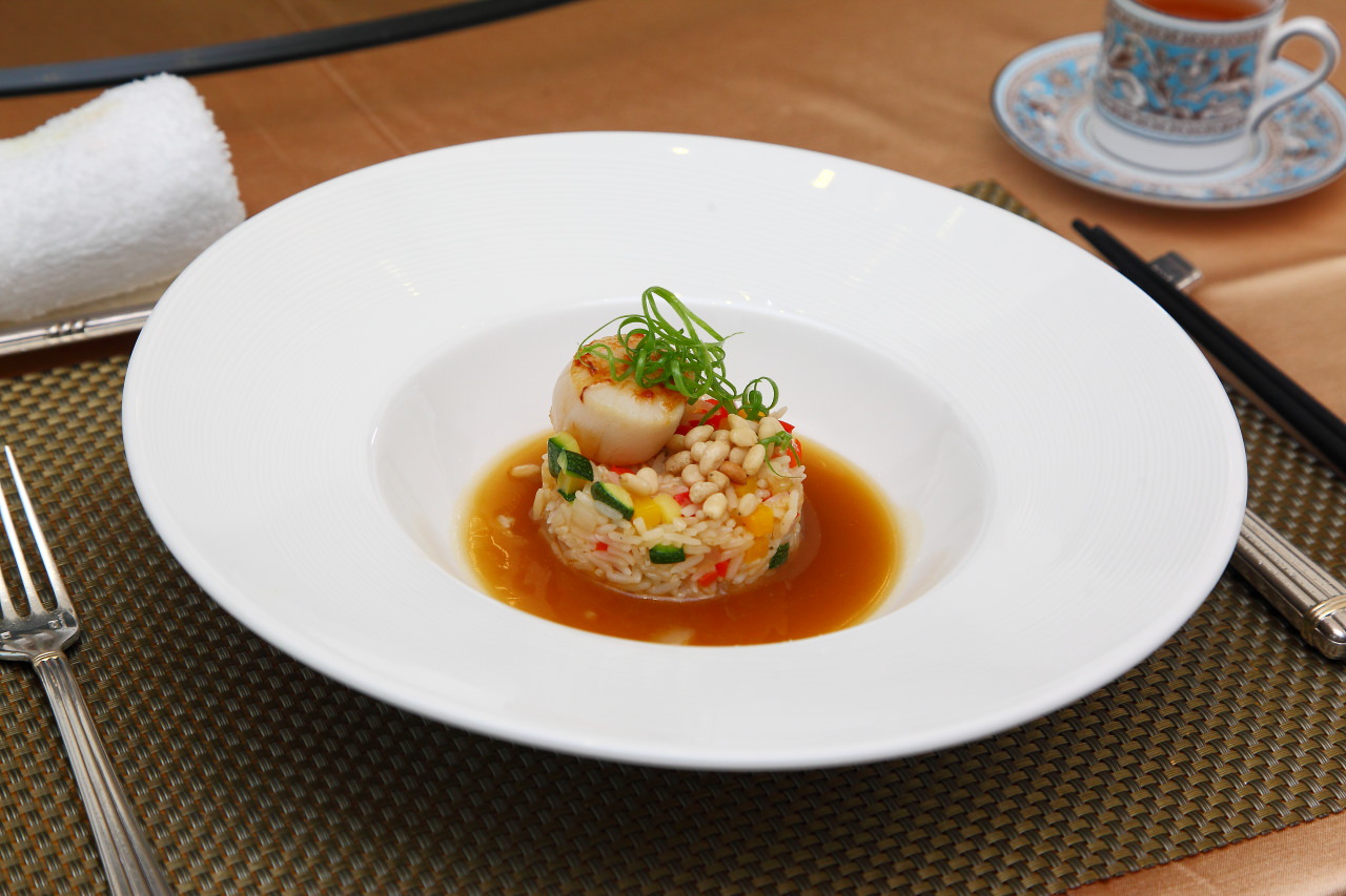 將西式的燉飯以中式料理的方式呈現,將鮑魚原汁加上老母雞湯烹調成醬汁,在以此醬汁搭配泰國香米燉飯,燉飯裡也拌入清脆的櫛瓜再佐以碩大的生食級大干貝