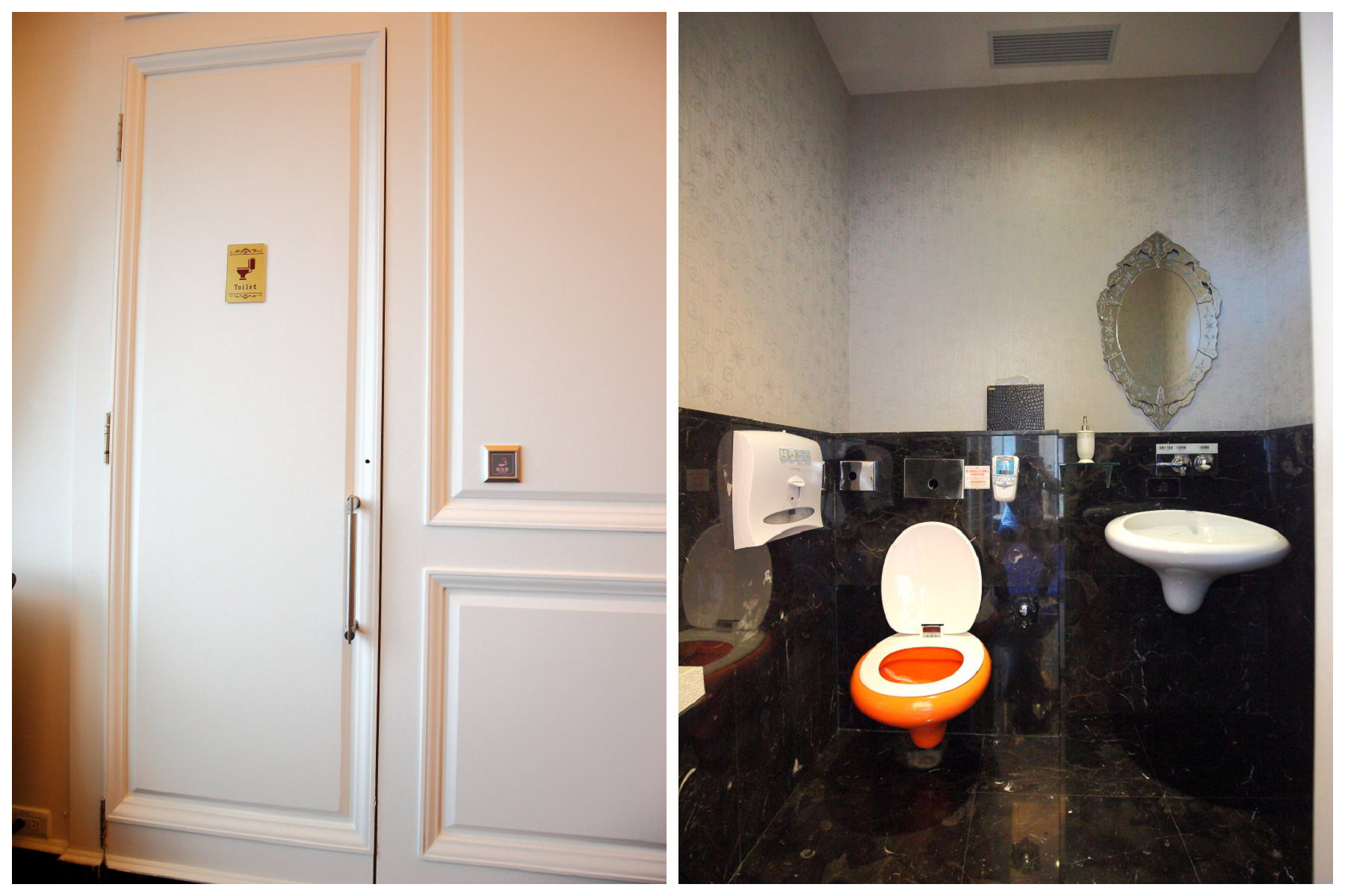 而且包廂還有獨立的廁所唷,是說這橘色的圓馬桶也太可愛了吧!