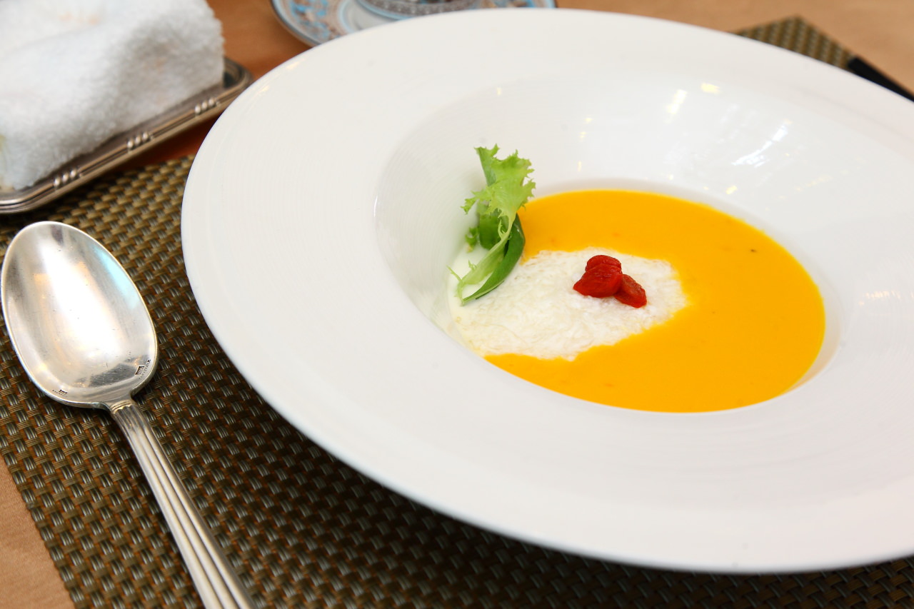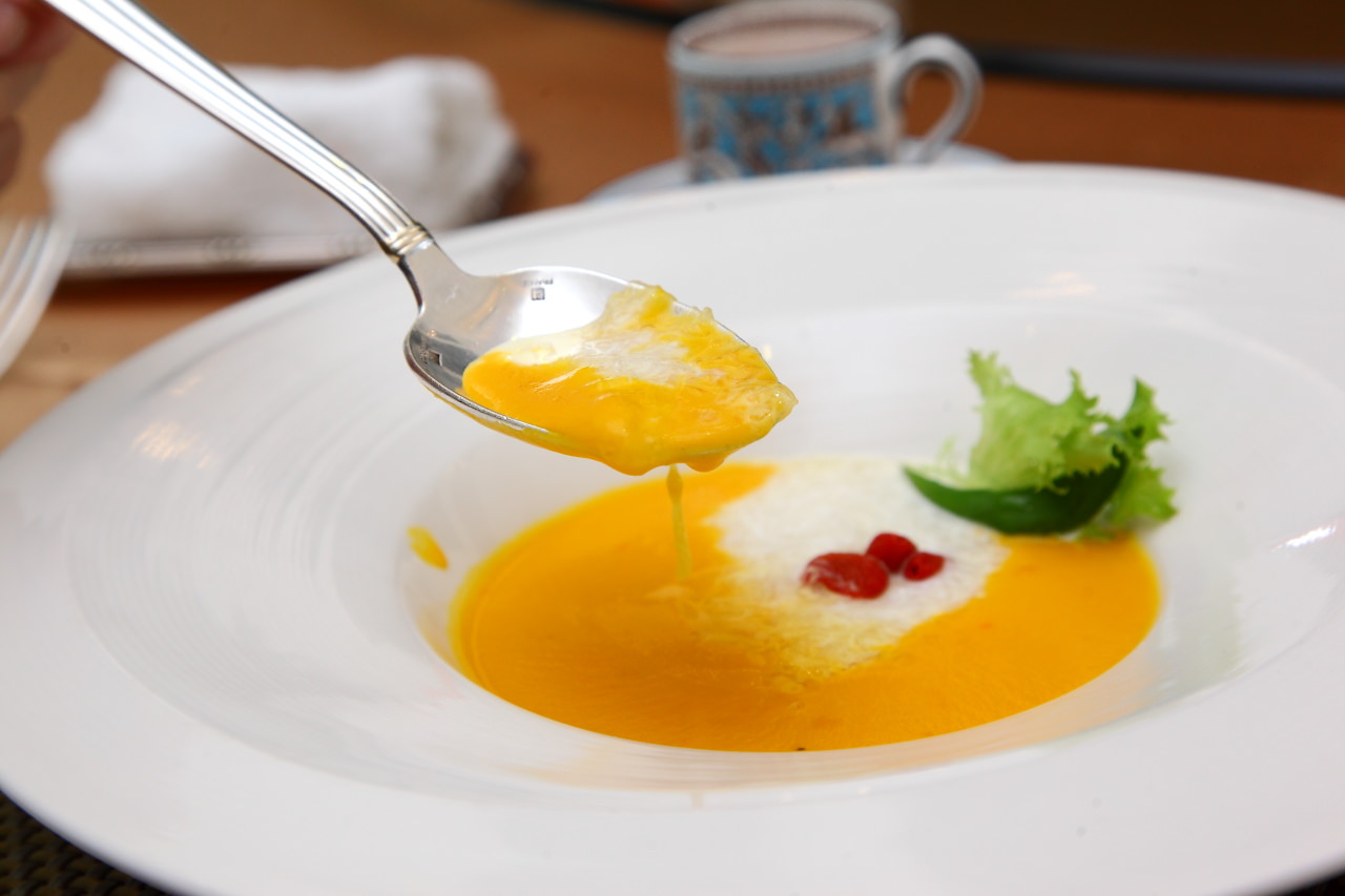 這道湯品採桌邊服務,首先服務生會先上冰鎮過的燕窩,再由服務生倒入熱的南瓜慕斯濃湯