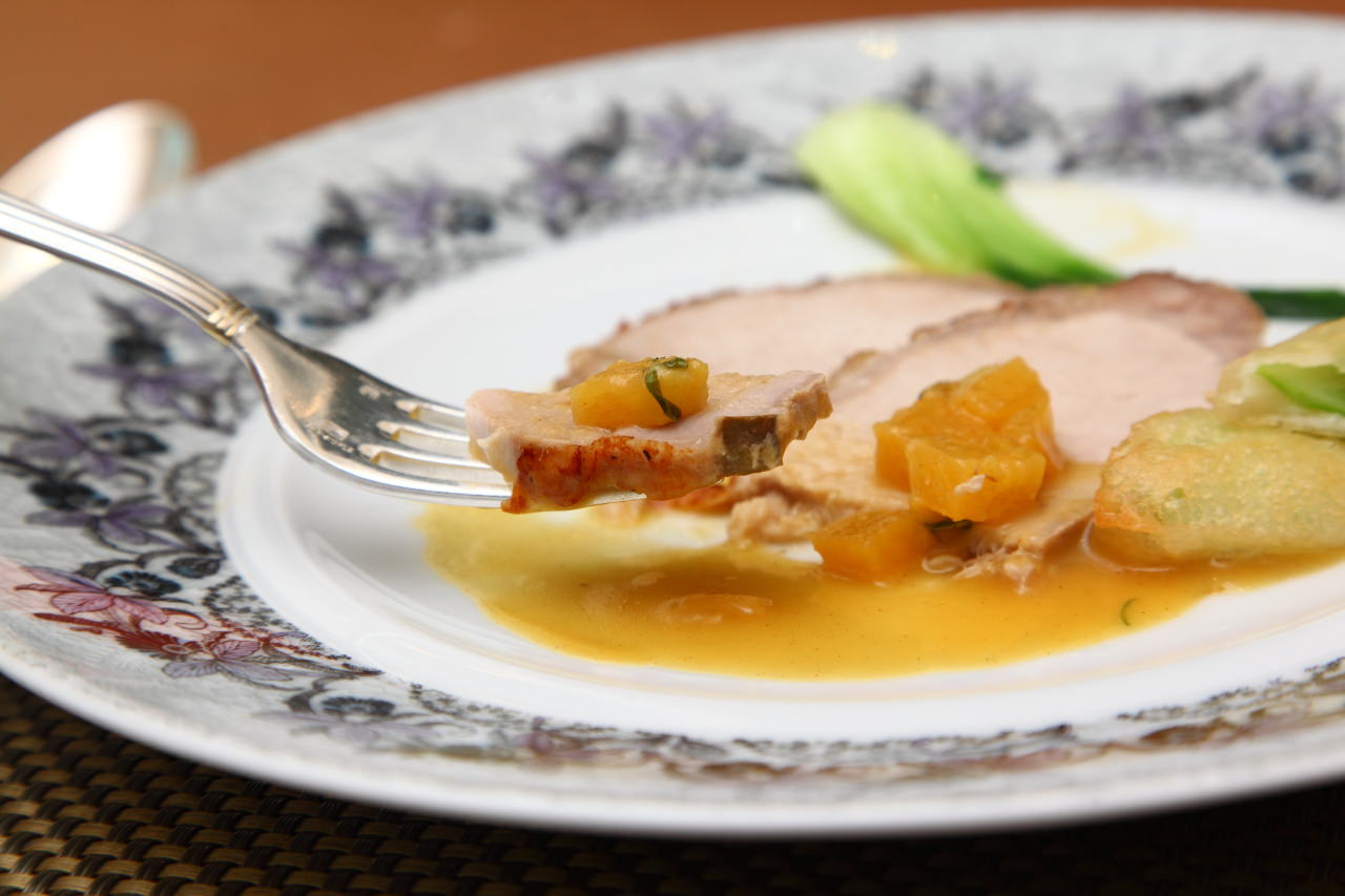 可惜今天咬咬&151造訪時恰巧伊比利豬售完了,主廚改以台灣雲林豬里肌代替,雖然少了伊比利豬特有的香草香氣及較為軟嫩的肉質,但搭配主廚特製以台灣鳳梨製作的夏威夷鳳梨醬,藉由鳳梨醬的果酸香氣及鳳荔酵素讓豬里肌的口感軟化,纖細的肉質包覆著微酸甜且濃香的鳳梨醬,加上粒粒多汁的鳳梨果肉一起入口,層層堆疊出令人讚嘆的美味,相信正式開賣時的伊比利豬口感應該會更臻完美極致!