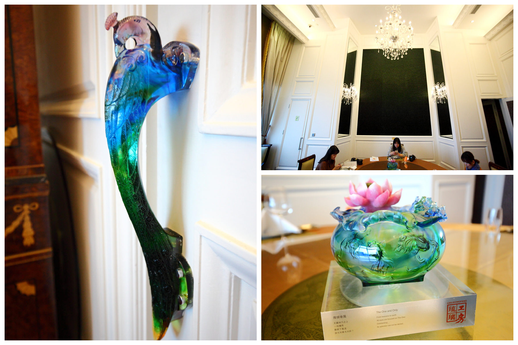 在許多小細節上也可以感受到頂鮮擔仔麵-台北101店想要給予顧客的奢華尊榮感,包廂門把及桌上擺飾都是來自琉璃工房的琉璃,要價不斐,包廂牆面更是以孔雀為主題,鋪上整面的孔雀羽毛,頂鮮擔仔麵-台北101店共有11間包廂,每間的孔雀毛裝飾也都不一樣