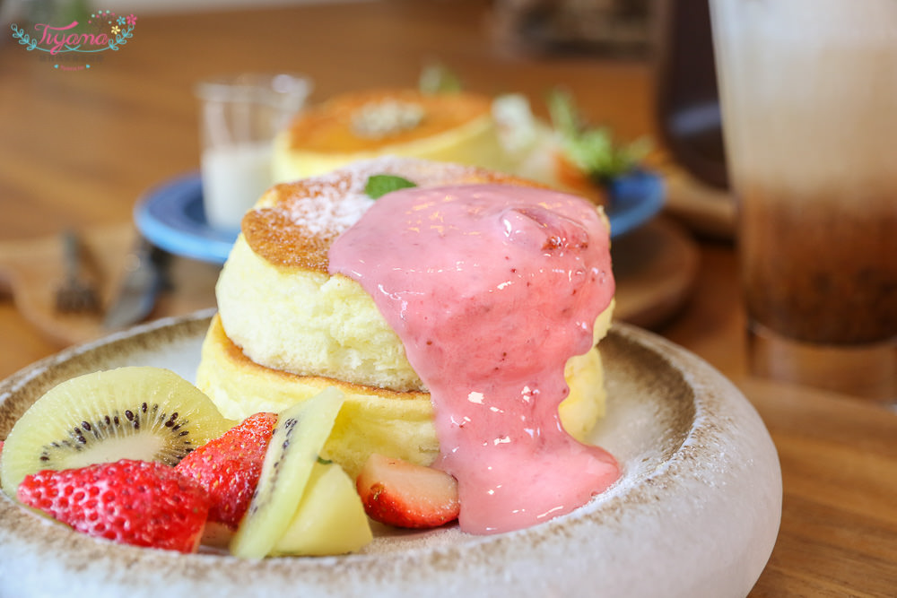 人見人愛的日式舒芙蕾厚鬆餅,最受歡迎的是「時旬鮮果」,今天的水果:草莓、黃金奇異果、漬蘋果,附上草莓淋醬,吸睛度百分百。