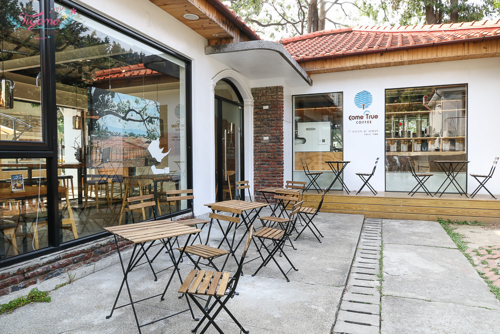 不能錯過的超吸睛三面落地窗,可愛逗趣的動物剪影,這可是審計新村最紅的IG牆,Come True coffee字體下方是”非洲西達摩的經緯度”,而成真咖啡選用的咖啡豆,源自於非洲,在老屋氛圍下…是不是很文青💕