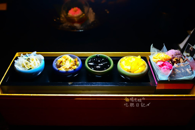 這道菜很漂亮,一上桌就擄獲了姐的少女心,一整個粉紅櫻花色澤好吸睛,每條都一樣粗細的山藥絲吃起來滑順有脆感和軟嫩的豆腐搭配出一軟一脆的口感組合,醬汁微甜微鹹,粉紅色的則是糖霜,好吃又好看