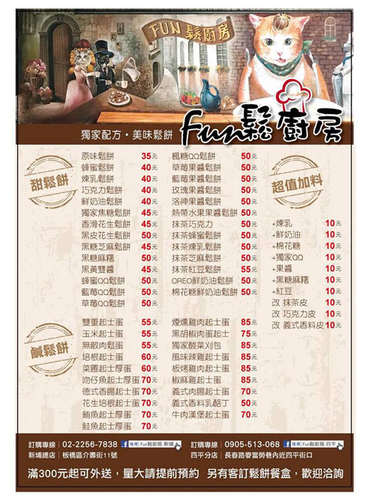 Fun鬆廚房是間鬆餅專賣店,麵糊是店家自行調配研發而成,即使冷掉還是很Q彈,而搭配的口味更多達40種,其中的「QQ系列鬆餅」是來自日本的高級烘焙食材,和麵糊一同烘烤後更是口感十足,無論甜或鹹鬆餅都是能讓人滿足的銅板美食呢。