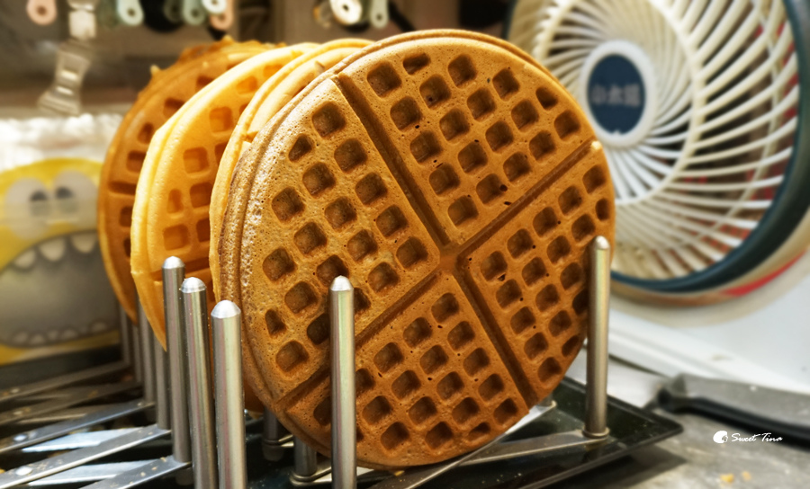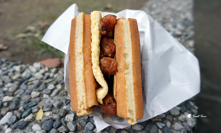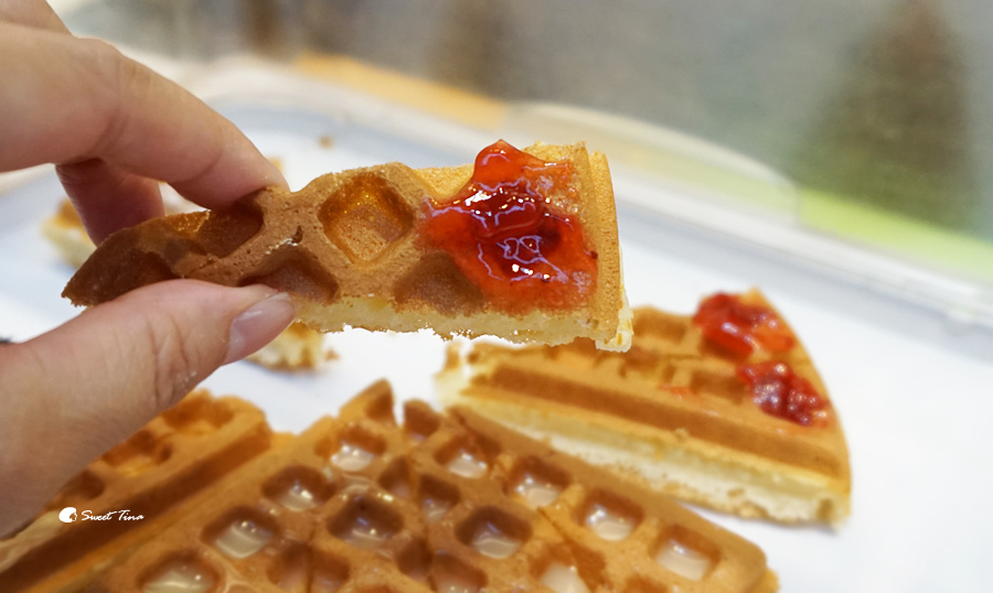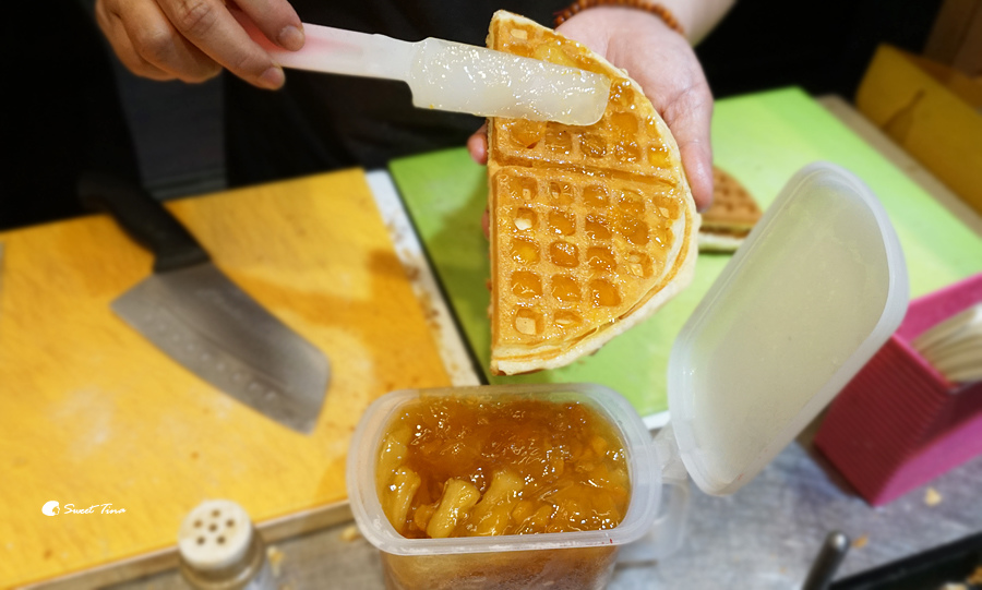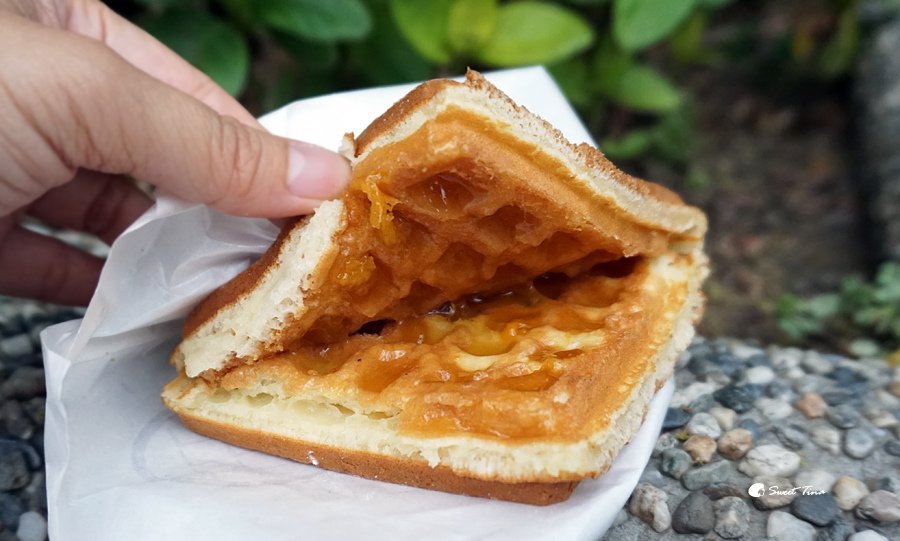 這個鬆餅的夾層裡是藍莓QQ,吃起來真的像是包了軟糖的內餡,微甜的口感超棒的,因為麵糊是店家自行調配的,所以甜度也抓得非常剛好,搭配起來完全不會感到甜膩,這口味超推的!