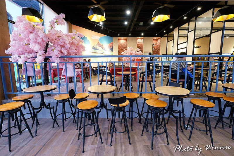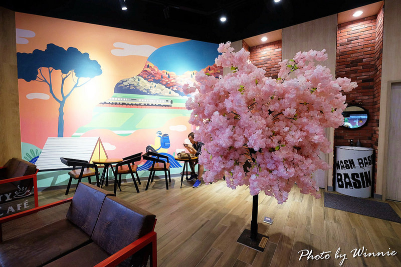 上層的部份就是上圖看到的這個部份,有兩顆的櫻花樹,再搭配上鐵道風的彩繪壁畫,中間的座位區還採用沙發座位設計,感覺是會讓人一屁股坐下就不想離開的座位區
