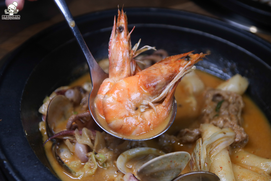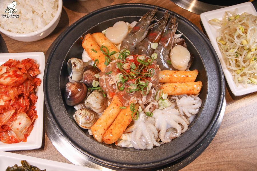 一鍋滿滿餡料的海鮮、干貝、蛤蠣、小章魚、辣味年糕、燒肉等美食