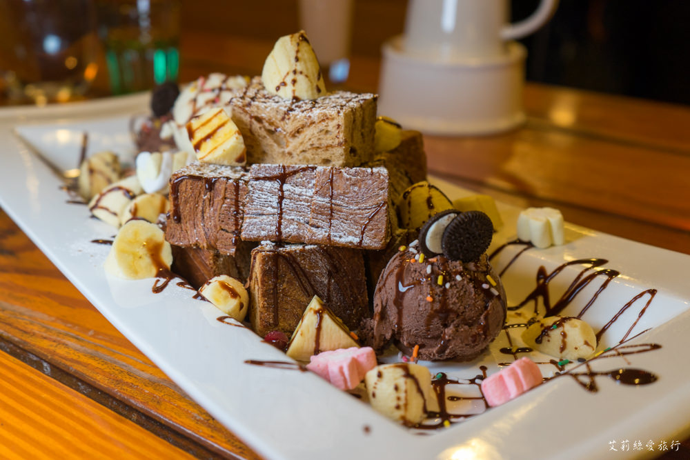 星月大地的蜜糖吐司是使用鬆軟的丹麥黑糖吐司,上層淋上糖粉及巧克力醬,吃起來甜度適中不會太甜,除了吐司還有香蕉及濃郁的香草冰淇淋及巧克力冰淇淋