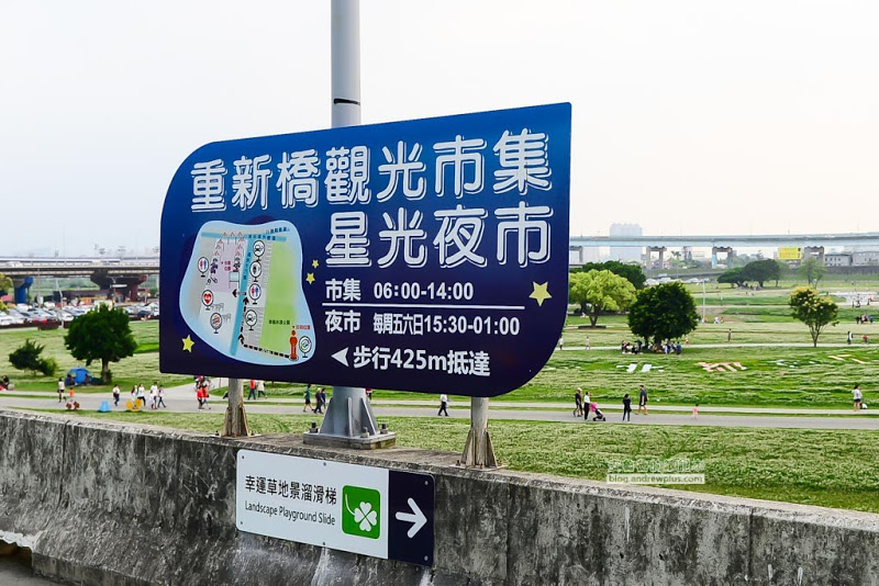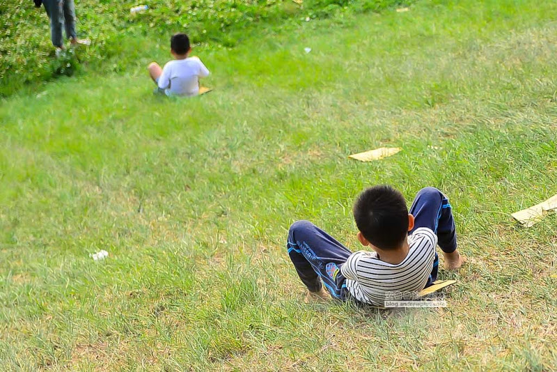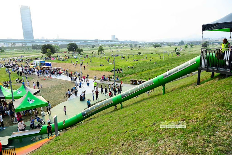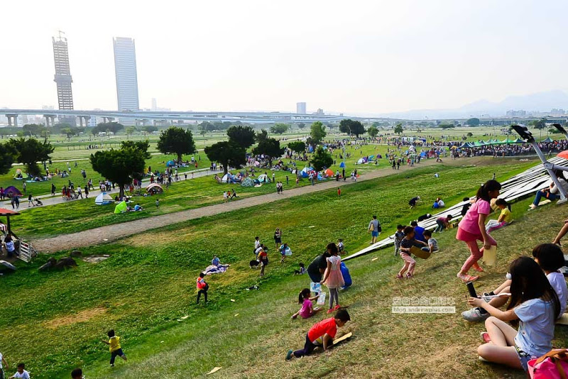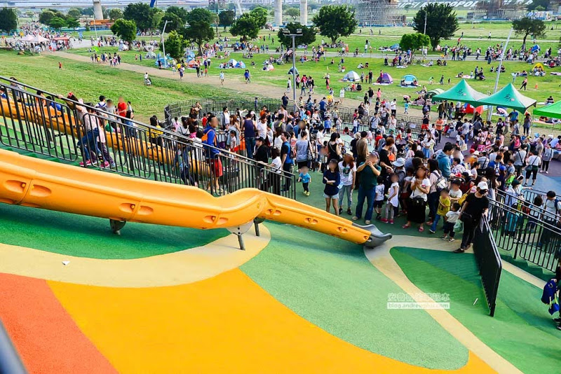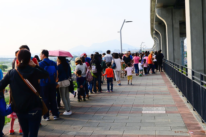 正當我在好奇怎麼堤防上站了一排人,突然間意會了過來,這串人龍不會是在排幸運草地景溜滑梯的吧!?