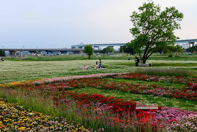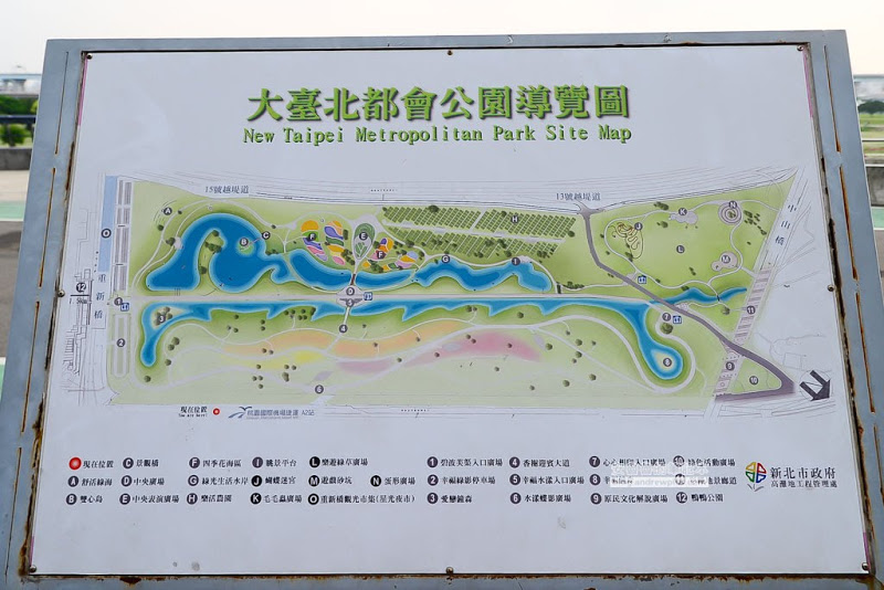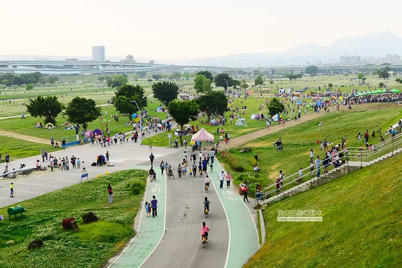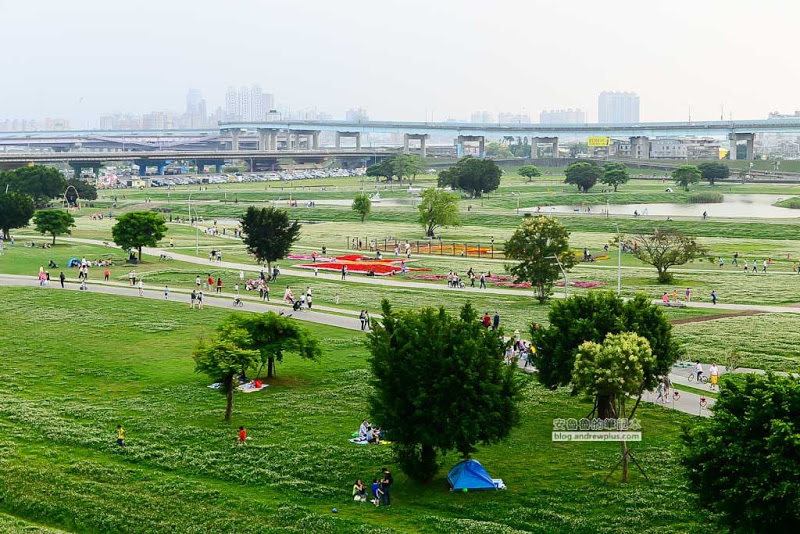 一走上堤防就看到已經有很多的爸媽帶著小孩們來到這個公園玩耍,這個公園佔地大約是16座大安公園的面積,看到這一望無際的綠地,我想除非穿著輪鞋,或騎著腳踏車不然我應該不會有那個勇氣逛一圈。