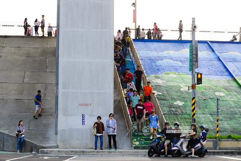 我們是清明連假的時候來的,人超級多的!過個馬路,爬過彩繪樓梯就可以跨過堤防囉~