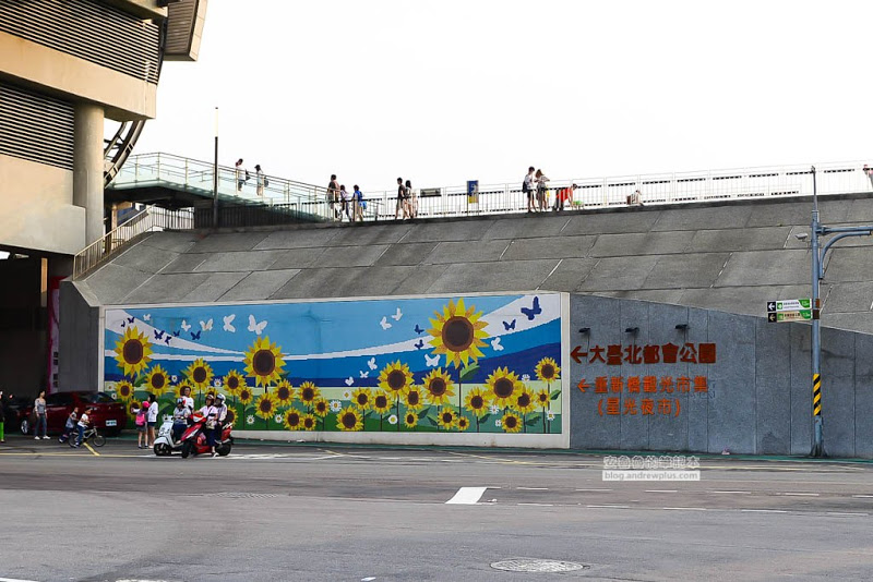 從1號出口出來,左手邊是疏洪東路,會看到一大片的向日葵壁畫,跨過這個堤防就是大台北都會公園啦!