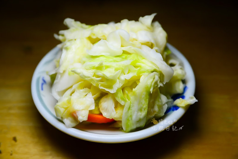 這道小菜端上來的時候,姐的臉上出現了問號,因為看起來就像是新鮮高麗菜端上桌,好像沒煮過、沒調味的樣子,夾起一片放進嘴裡咀嚼,吃起來有種類似酸梅汁的鹹酸甜滋味,咬起來是咔滋咔滋的聲音和脆感,光看外表完全無法想像口感和調味。