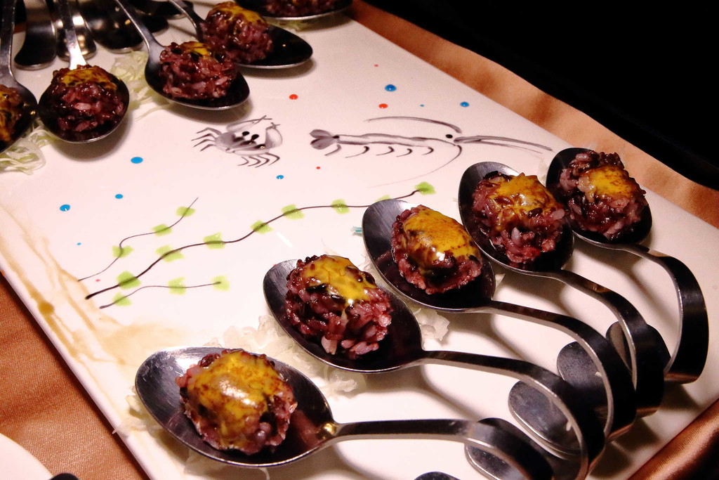 可以把這道稱為櫻桃鴨握壽司,用養生的紫米配上取自鴨子油脂最豐富的表皮,