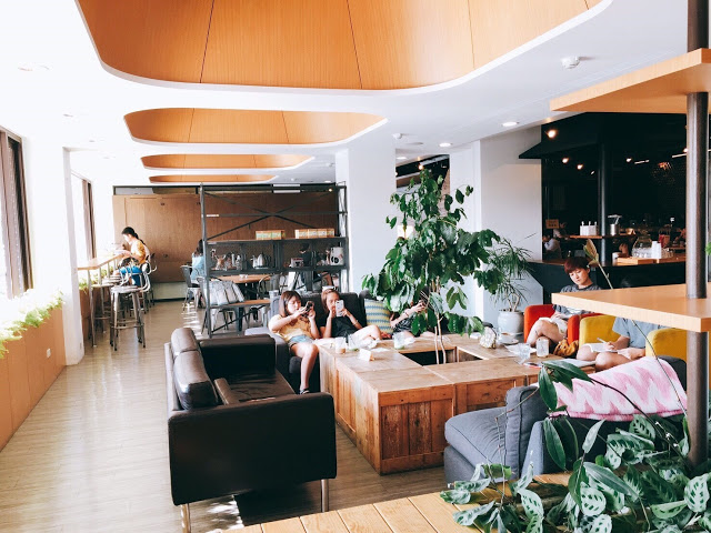 寬敞的空間跟舒適的氛圍,、木質桌椅與誇張主視覺