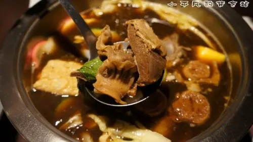 以寫有東悅兩字的黑色陶碗裝盛,下面點著火,像是吃火鍋一般,冬天吃最過癮,。湯頭以30種以上的中藥材加紅甘蔗頭熬製,甘甜不膩,溫潤順口。6~7塊的帶皮羊肉,皮Q彈,肉細嫩,一咬即骨肉分離!沾上店家提供的醬料(豆瓣醬加豆腐乳),甜甜辣辣的滋味,更能襯托羊肉的嫩!