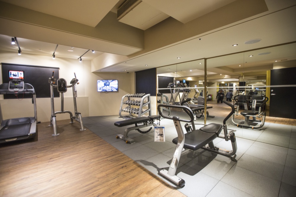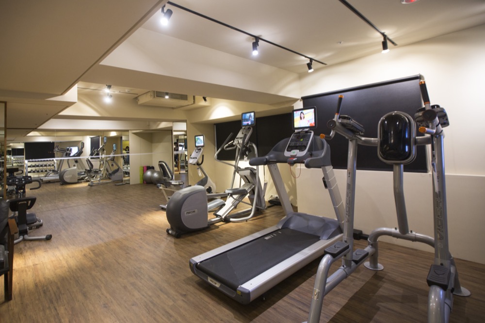 健身房的器材應有盡有,跑步機、腳踏車、滑步機以及訓練手部、胸部的啞鈴組