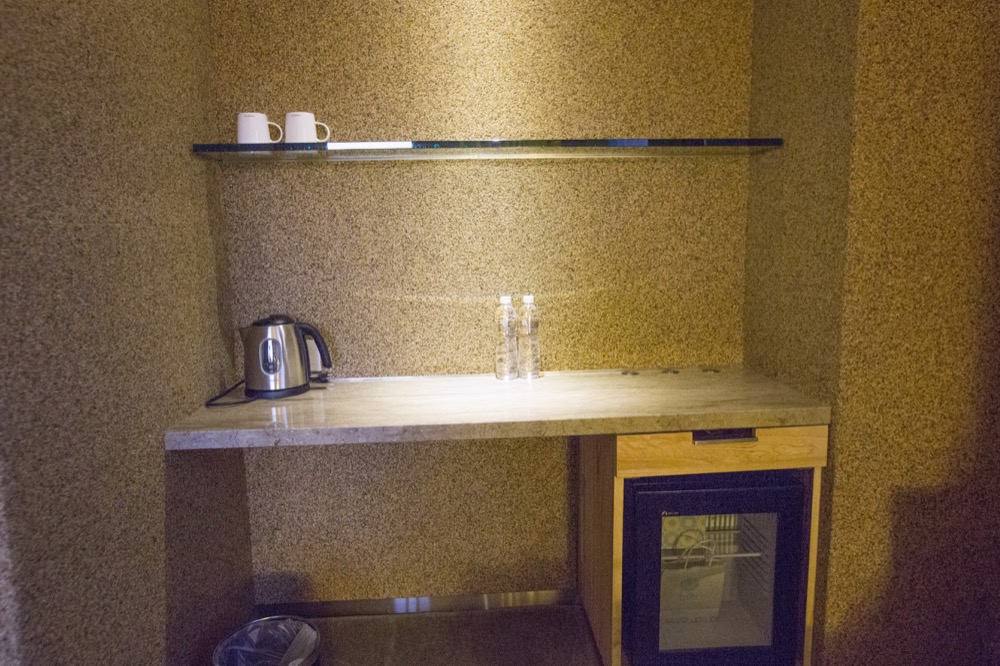 另一側馬克杯、電熱水壼、免費礦泉水、冰箱
