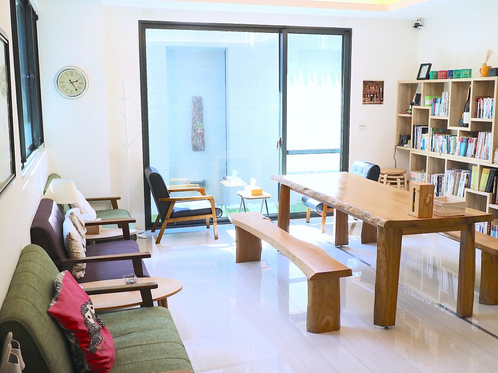 方正的大坪數空間,靠牆為整排舒適的沙發椅,中央擺放著一大張的木製桌椅