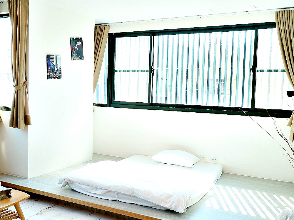 這個和式平台提供加床服務,純白床組在台南暖陽下曬著日光浴~