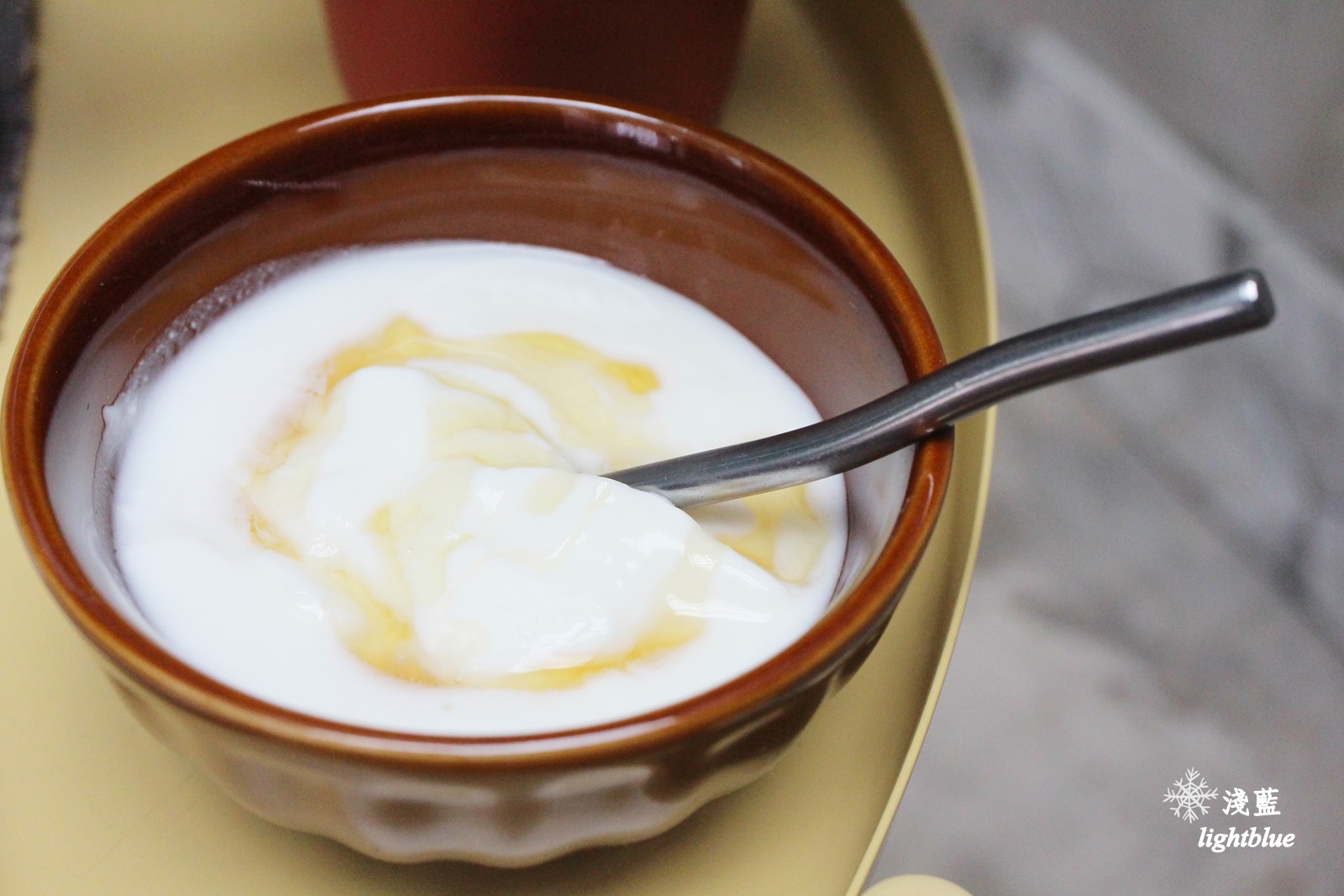 本來想點杭州限定的飯糰,不過看了一下現場點餐的人,好像跟一開始別人食記拍到的一整盤不太一樣,就只有簡單兩個飯糰而已,所以我就改變心意點了開放式三明治,這是三明治附的優格,上頭淋了一點蜂蜜很加分
