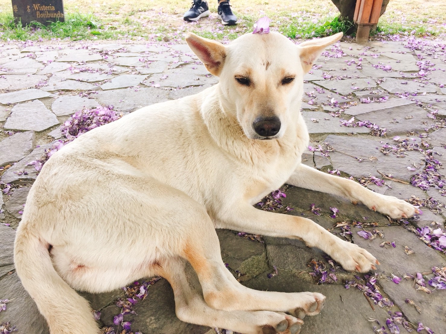 巧遇可愛的小白狗,愜意地任由大家拍照