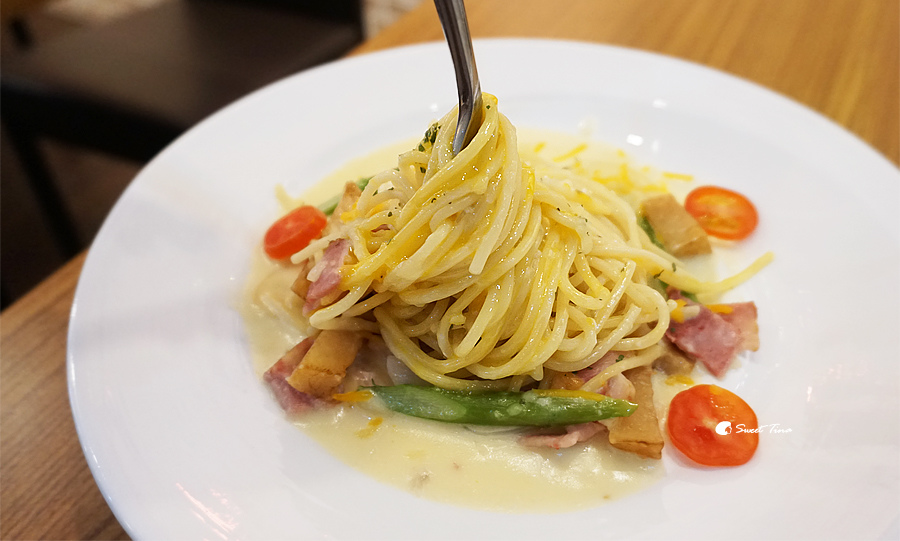 生蛋黃煙燻培根義大利麵 - 這道是店家的人氣商品,深受不少小朋友喜歡呢,重點是上面的蛋黃也很吸引我,所以我忍不住就點了,蛋黃控快看過來啊!