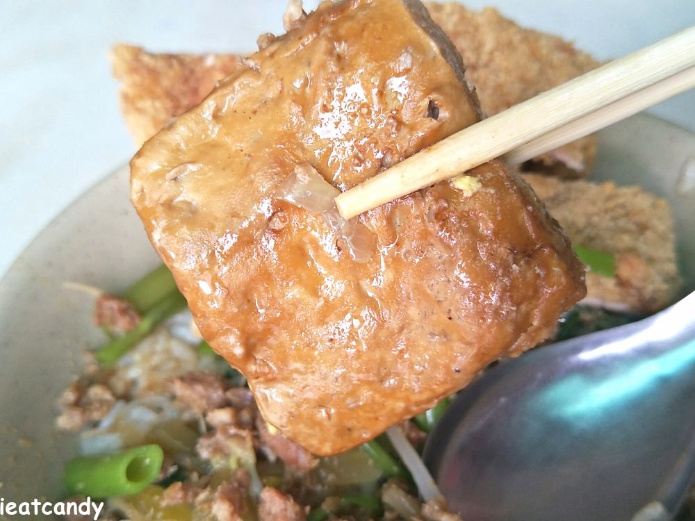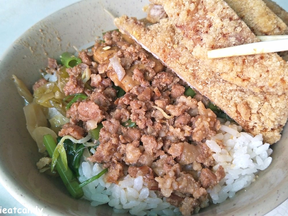評論:這間的配菜是juicy的滷豆干,吃起來不會柴柴澀澀,不喜歡吃豆干的我也覺得不錯。排骨炸粉偏淺,也是帶有厚度的,當天吃得比較乾一點點,稍嫌可惜。滷汁的肉末挺多,一旁的酸菜(榨菜?)也挺不錯的。