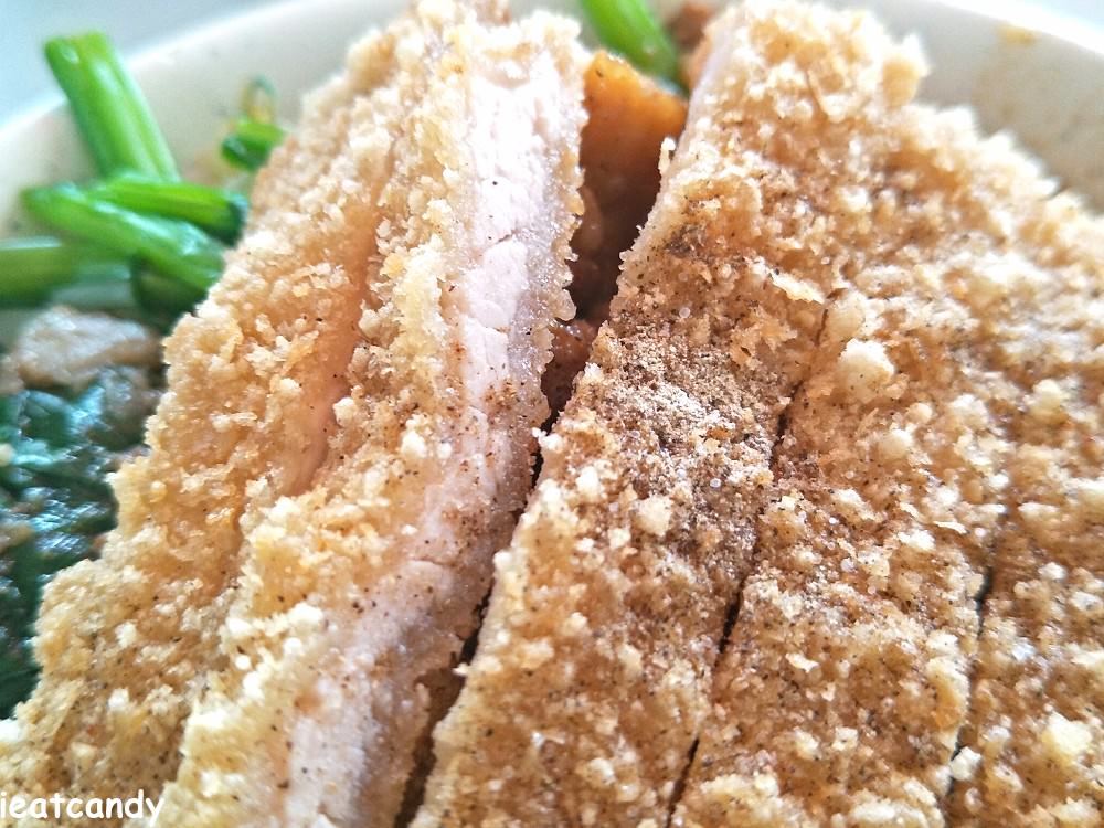 評論: 排骨炸粉是偏深的,不像上兩間較長,這間屬於短小精幹型的(誤),不過肉的份量我個人覺得也有比較多一點,配菜直接提供半顆滷蛋,滷汁的肥肉末是三家中較多的,吃起來會比較油滑一點。這間也是我唯一有淋上甜辣醬的,果然很對味阿~可惜其他兩間我都忙著吃忘記加了….
