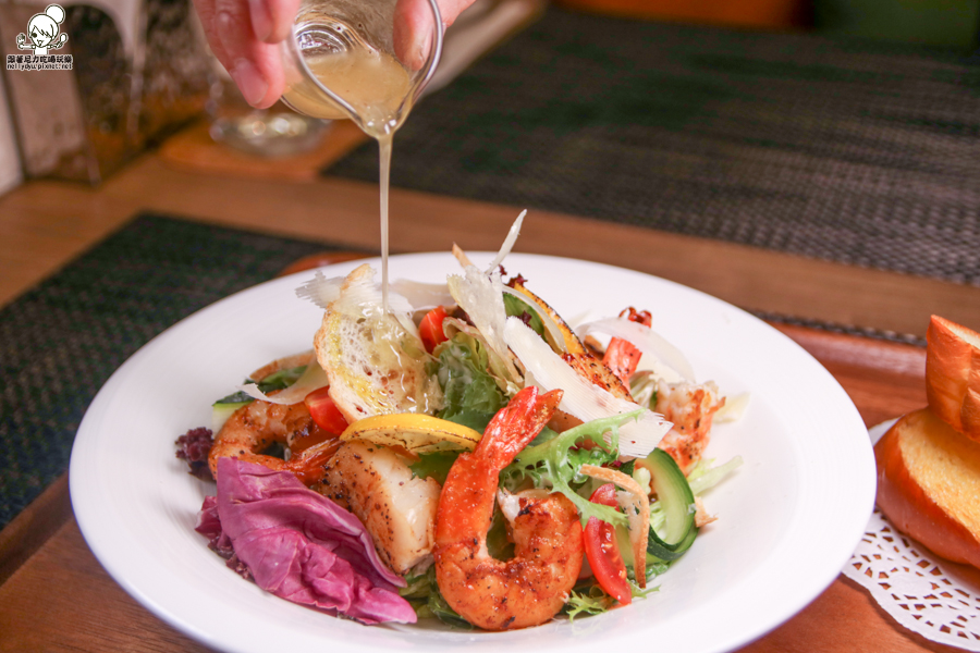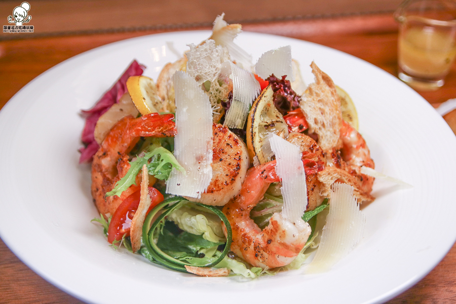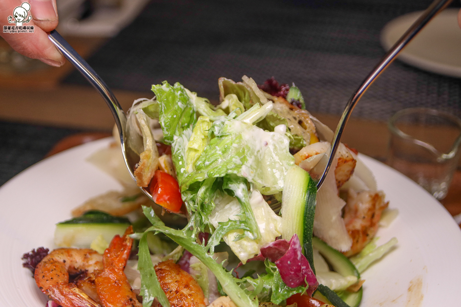 搭配綜合野生菜,刨上起士片提出濃郁香氣,很大器的搭配了四大尾炙燒過的鮮蝦
