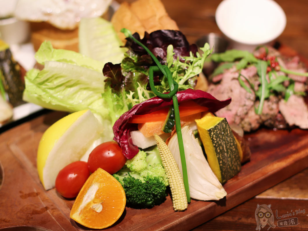 蔬菜分量果真令人瞠目結舌 ,很少有機會一餐能夠吃進這麼多種類的蔬果 ,五顏六色新鮮清脆 ,番茄、柳丁、胡蘿蔔、玉米筍、花椰菜 、地瓜 、洋蔥 、香瓜、綠捲 、羅美生菜…還有一隻非常不必要出現的韭菜😅😅(說真的這隻韭菜應該拿掉,它好難咬)。洋蔥甜脆一點也沒有生味,各種品項品質都很優質 。